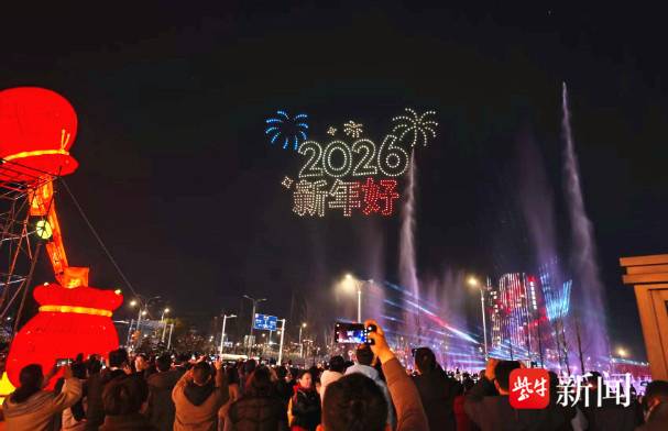 表演持续进行。“2026”字样配合礼花图案在空中绽放,表达辞旧迎新之意;“策马向扬州”的骏马图案,将“春风知我意,吹梦到扬州”的诗句具象呈现。紧接着,万福大桥以彩虹光影横跨天际,“春到万福”四个鎏金大字熠熠生辉,这座地标建筑瞬间吸引了大家的目光。“看,万福大桥!”几位年轻人指着空中的图案大声说。家住生态科技新城的陈女士告诉记者:“每天都要路过万福大桥,今天看它在天上亮起来,感觉特别亲切,特别开心。”不知不觉间,孩童乘豚踏浪、福字与波浪交织的画面接连亮相,传递“福伴华彩灯辉”的美好寓意。而次第出现的高铁与芯片图案,则巧妙呼应了生态科技新城的交通优势和科创定位,展现了现代与传统交融的魅力。