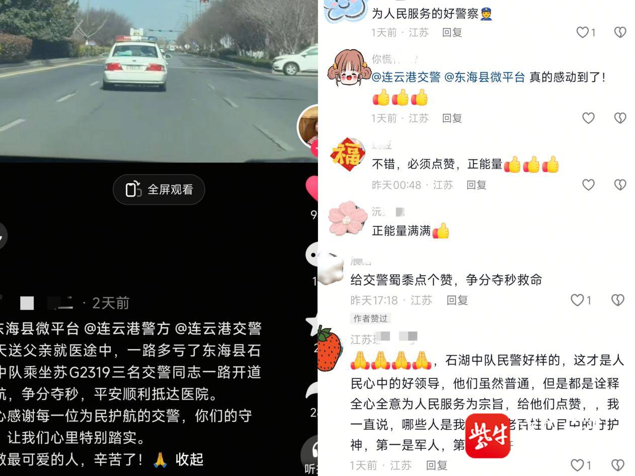 “今天送父亲就医途中,一路多亏了石湖中队三名交警同志开道护航,争分夺秒,平安顺利抵达医院。”事后,范某的儿子特意编辑短信向民警丁训高报平安,字里行间满是感激之情。他还将三位交警热心救助的过程发到了网络平台上,立即引起了网友的广泛赞誉。