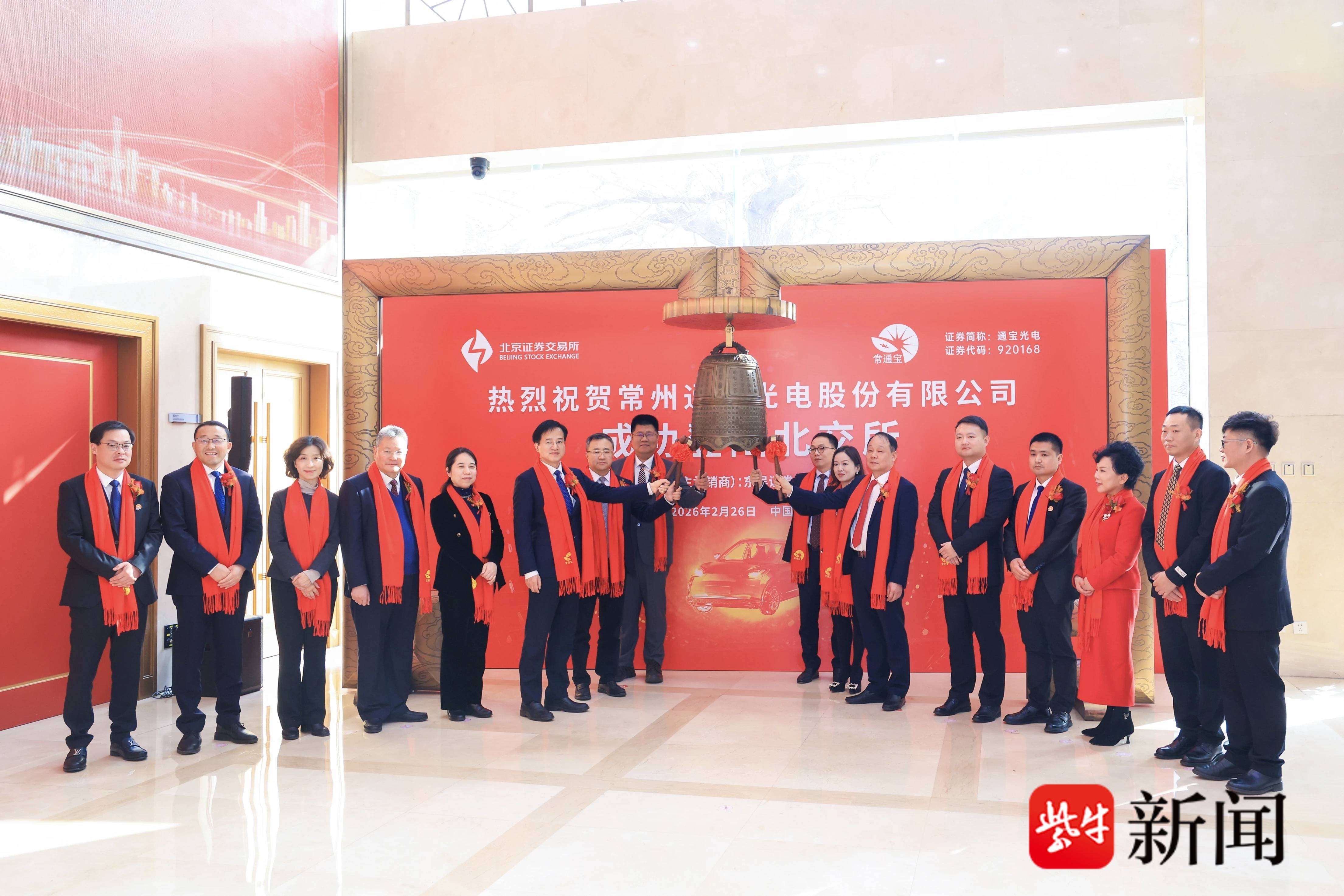 2月26日上午9:30,常州通宝光电股份有限公司(以下简称:通宝光电,证券代码:920168)成功登陆北京证券交易所,成为2026丙午马年春节后全国首家上市企业。常州市副市长徐军、常州高新区党工委(区委)书记石旭涌、常州通宝光电股份有限公司董事长刘国学等共同为企业敲钟开市。