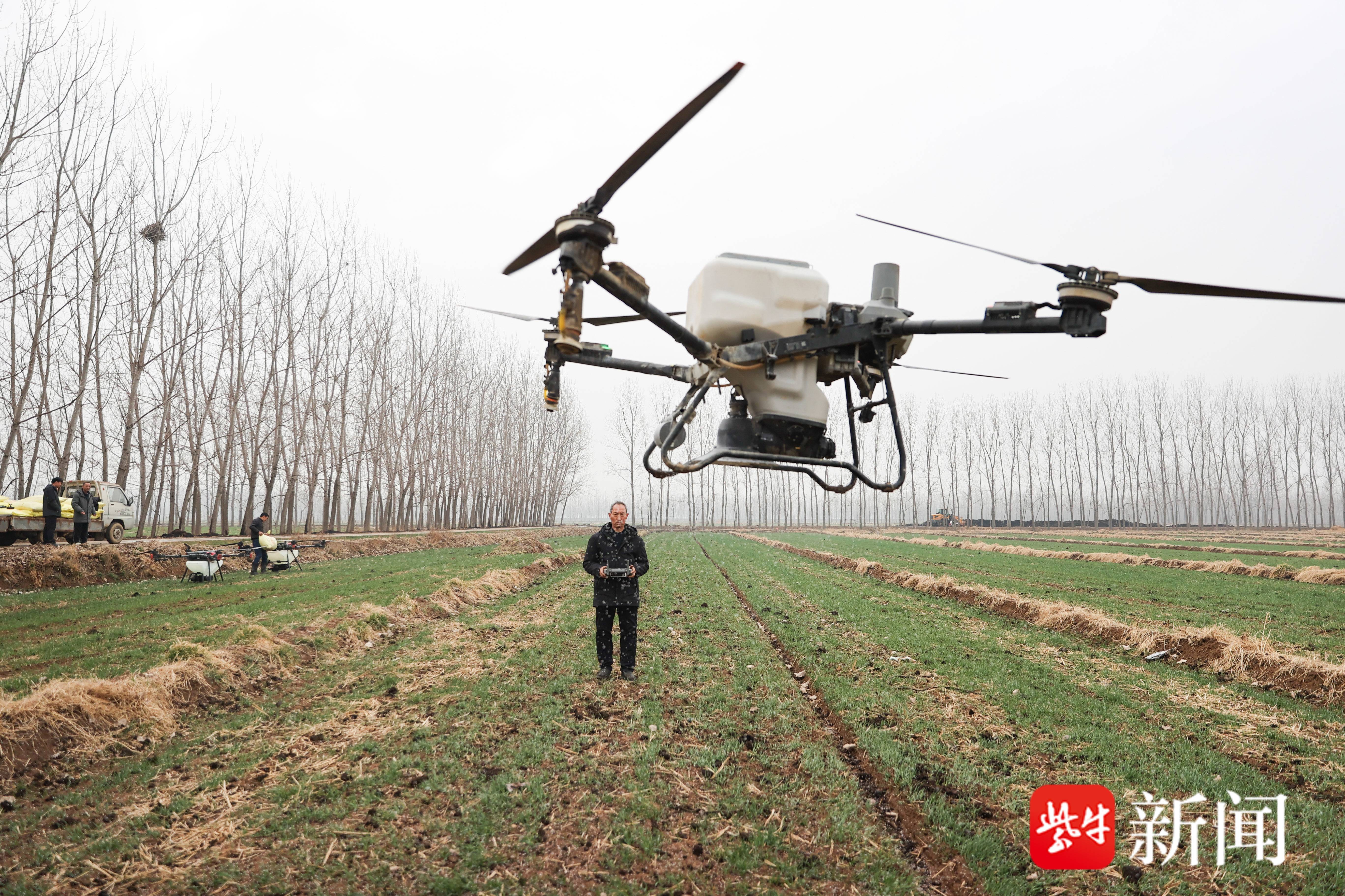 田埂那头,三台植保无人机在机手的操控下腾空而起,沿着预设航线在麦田上空匀速飞行,细密的肥料颗粒如雨雾般均匀洒落。机手介绍,当前应用的无人机具备循环巡航和自动避障功能,药液循环不沉淀,喷洒均匀不漏喷,单日作业效率可达400亩,是人工的20倍以上。“省工、省时、还省心,这‘铁疙瘩’成了我们种地的‘新农具’。”林杰指着自家的千亩麦田说,“昨天雨停,今天开干,有农技干部在田头把关,有高科技设备助力,今年丰收心里有底了!”