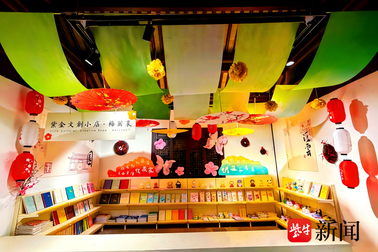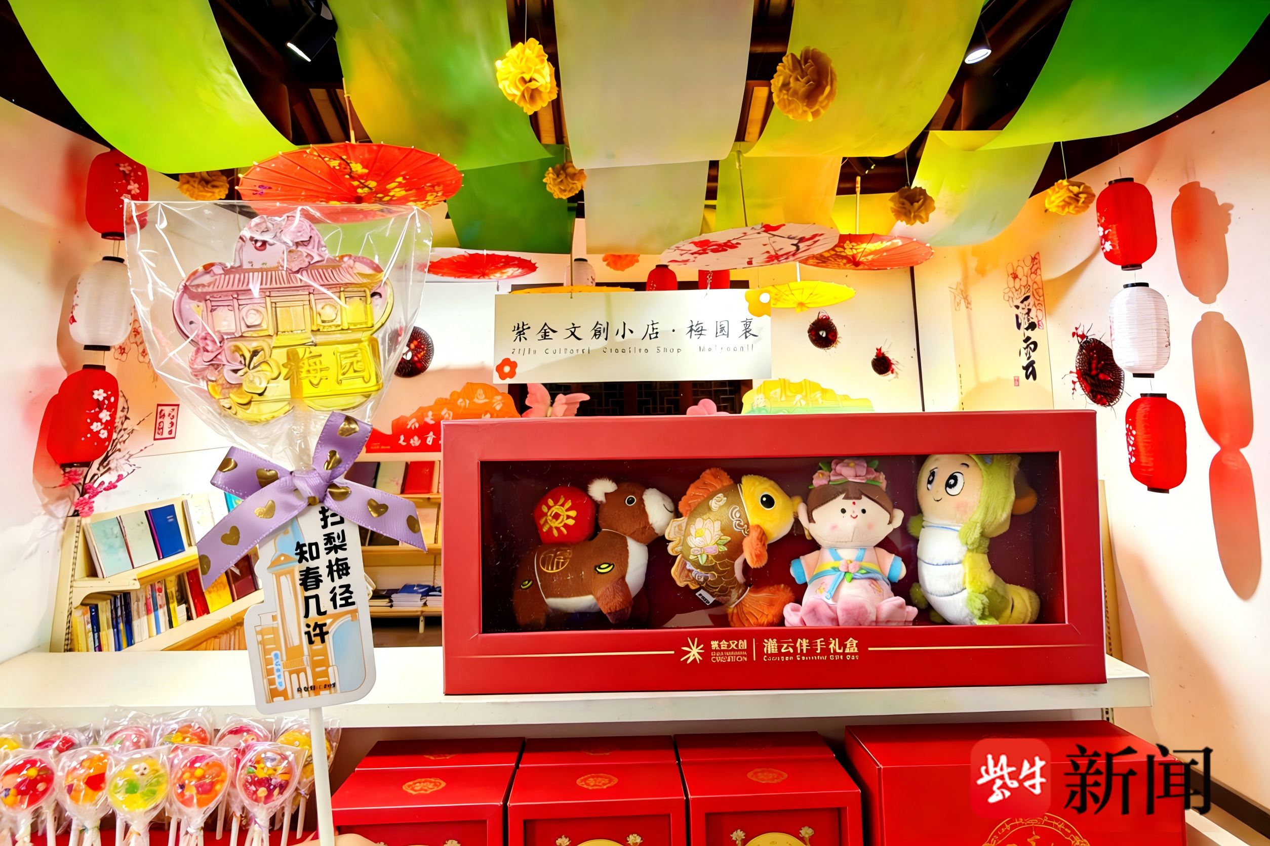 除了主题活动之外,值得一提的是,由紫金文创精心打造的灌云梅园景区文创小店正式焕新营业,文创小店推出梅园定制棒棒糖、灌云伴手礼毛绒玩具礼盒等一系列特色文创产品。店内空间设计独具匠心,翠绿绸幔搭配朱红灯笼、油纸伞错落点缀,与窗外的万亩梅林相映成趣,营造出 “人在景中、景藏店中” 的沉浸式氛围。