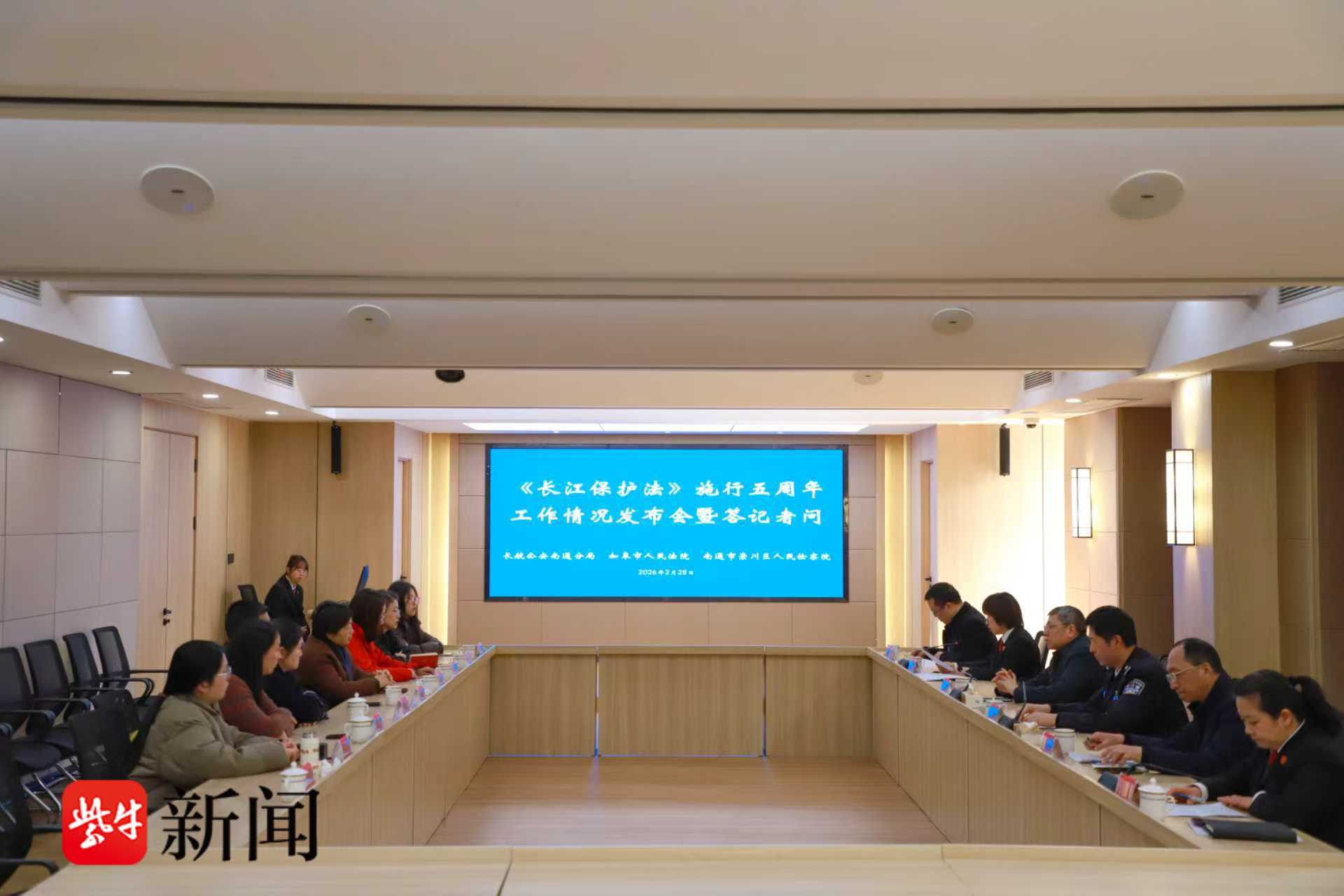 随后,《长江保护法》实施五周年工作情况联合发布会在如皋法院长江二庭接续召开。参会人员共同观看汇报片《沧桑巨变中的司法担当》,镜头之下,五年来南通司法机关深耕长江大保护的坚实足迹、攻坚克难的生动实践与成效斐然的生态答卷徐徐展开,让现场人员直观感受长江保护背后的坚守与担当。答记者问环节,公检法三家单位直面媒体关切,针对长江保护工作中的热点、难点问题逐一细致解答,既讲清工作举措,又回应社会期盼,让公众对长江生态司法保护的实践与成效有了更清晰、更全面的了解。