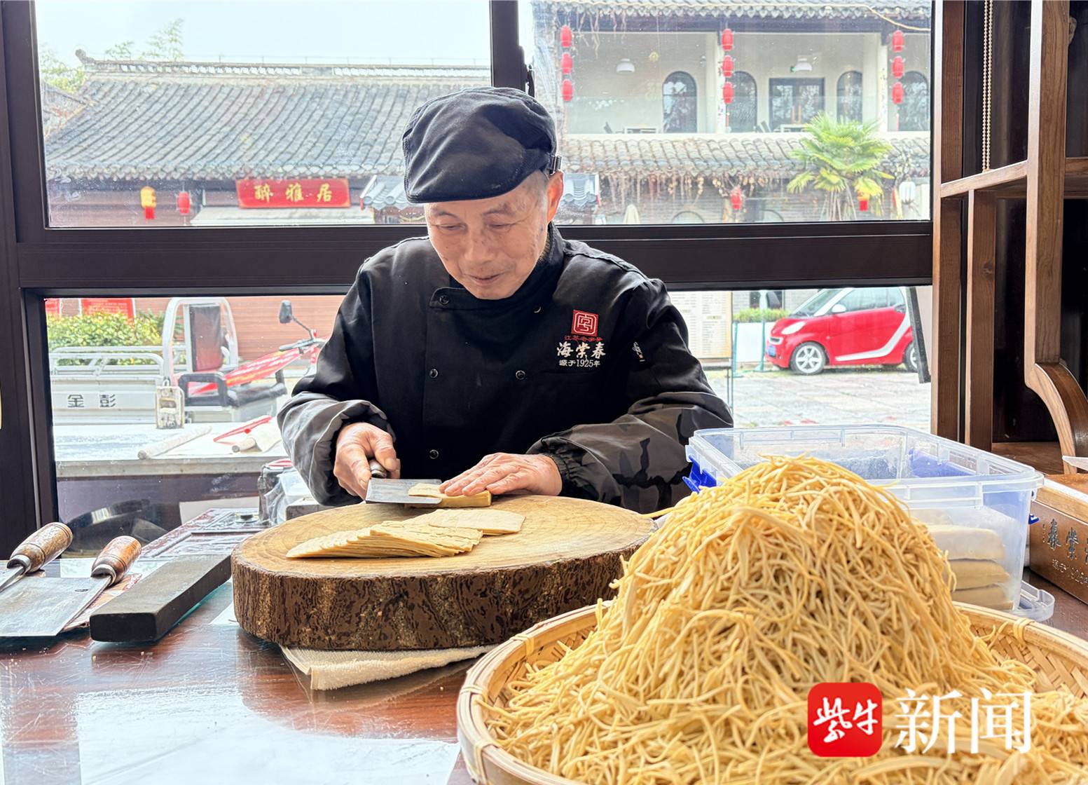 清晨五点半,天刚蒙蒙亮,泰州海陵区老街的海棠春早茶店已灯火通明、热气氤氲。揉面的力道、切干丝的声响、茶汤的香气,交织成最动人的市井乐章。店门口,清末状元、实业家张謇亲笔题写的“海棠春”匾额,历经近百年风雨依旧清晰可辨,见证着这家小店从寻常茶肆,成长为集多项非遗于一体的省级非遗工坊、泰州城市文旅名片。