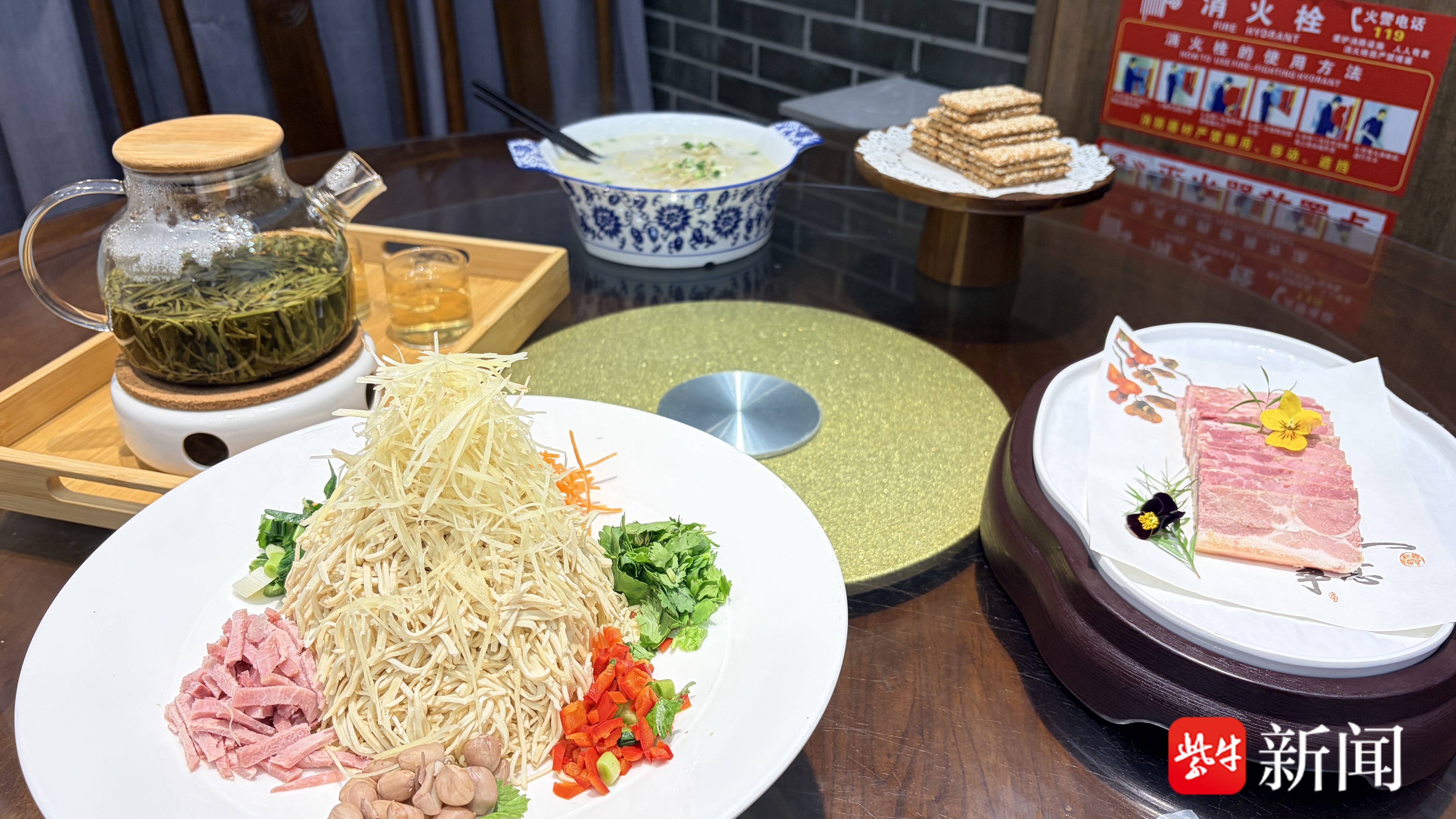 店内操作台旁,78岁的非遗传承人刘明喜专注切着干丝,薄如蝉翼的干丝淋上虾子、麻油,香气扑鼻;73岁的蒋广义师傅手工制作跳面,揉、醒、擀、跳一气呵成,劲道十足。一碗干丝、一碗跳面、一块麻饼、一碟肴蹄、一壶海棠春雨茶,店内五项泰州非遗美食,承载着老泰州记忆,也凝聚着四代传承人的匠心。百年间,小店环境、客流虽变,用料的实在与手艺的坚守从未改变,既守住了家族“小家”生计,也守住了泰州早茶的非遗根脉。