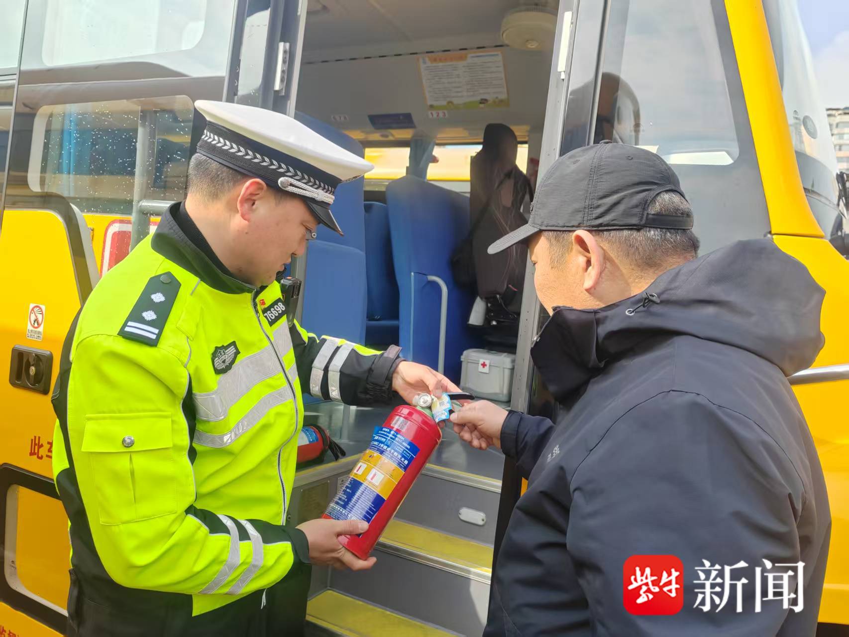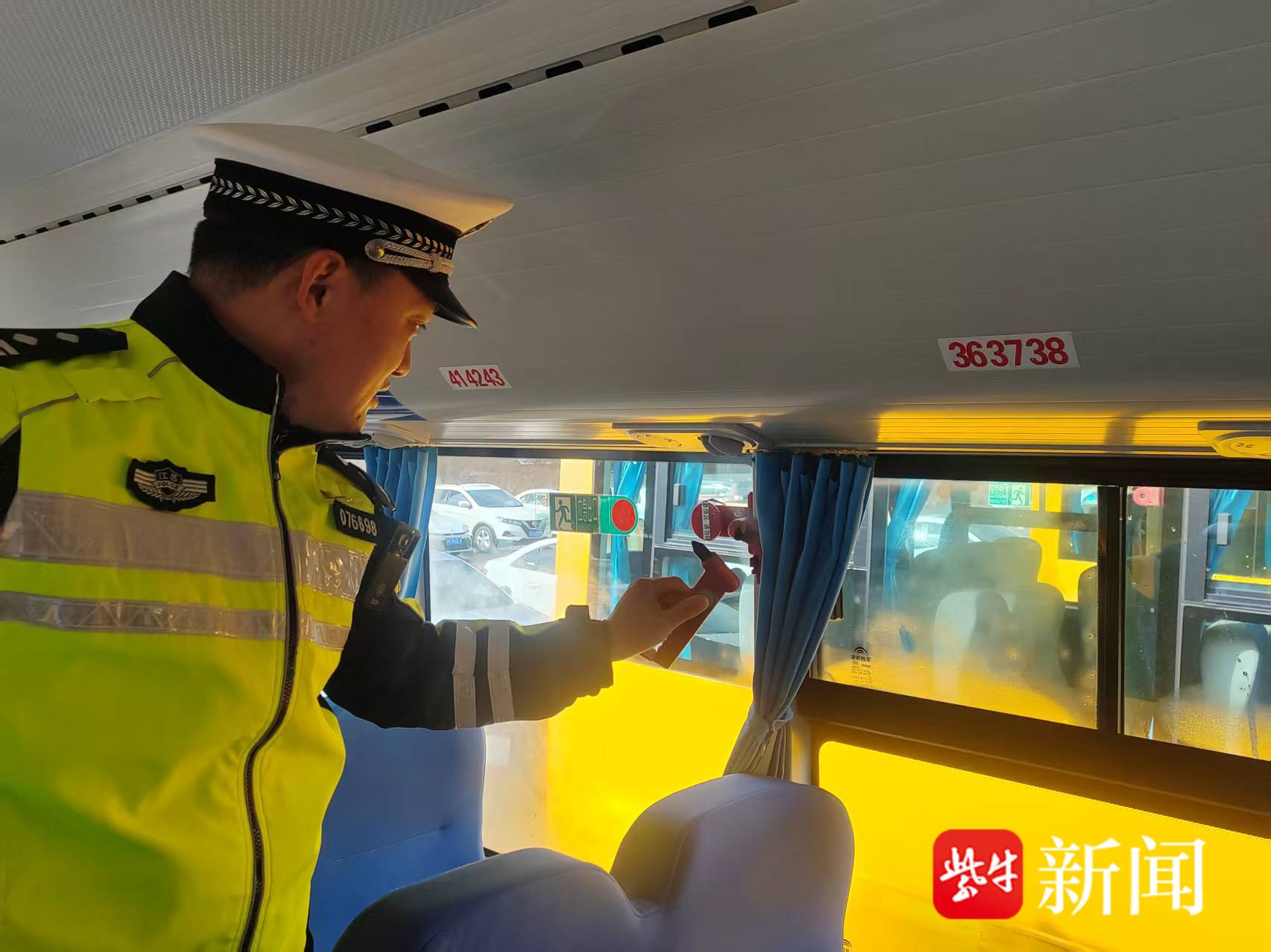 走进车厢,民警对车内安全设施进行了“地毯式”排查。从安全带的伸缩与完好性,到灭火器的压力值及有效期,再到安全锤的安放位置,每一处细节都不放过。民警叮嘱驾驶员:“这些设备平常看着不起眼,关键时刻就是孩子们的救命稻草。”