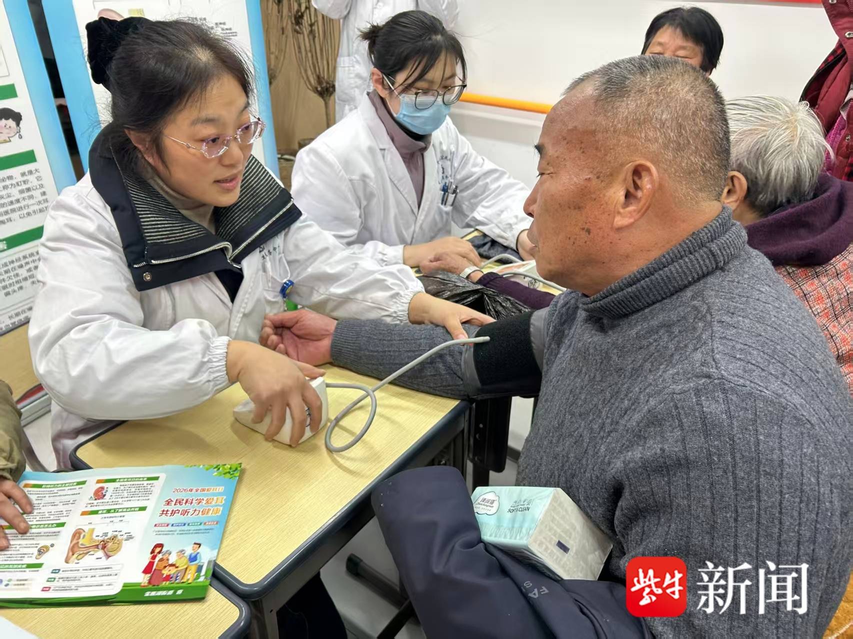 为让健康服务更贴近群众,本次活动特别邀请宝瓶湖街道卫生服务中心医护人员到场,为居民提供免费测量血压、耳部检查等便民服务。医护人员认真细致地为居民检查耳道、了解听力情况,对常见耳部问题进行专业解答和健康指导,提醒大家养成良好用耳习惯,出现不适及时就医,做到早预防、早发现、早干预。