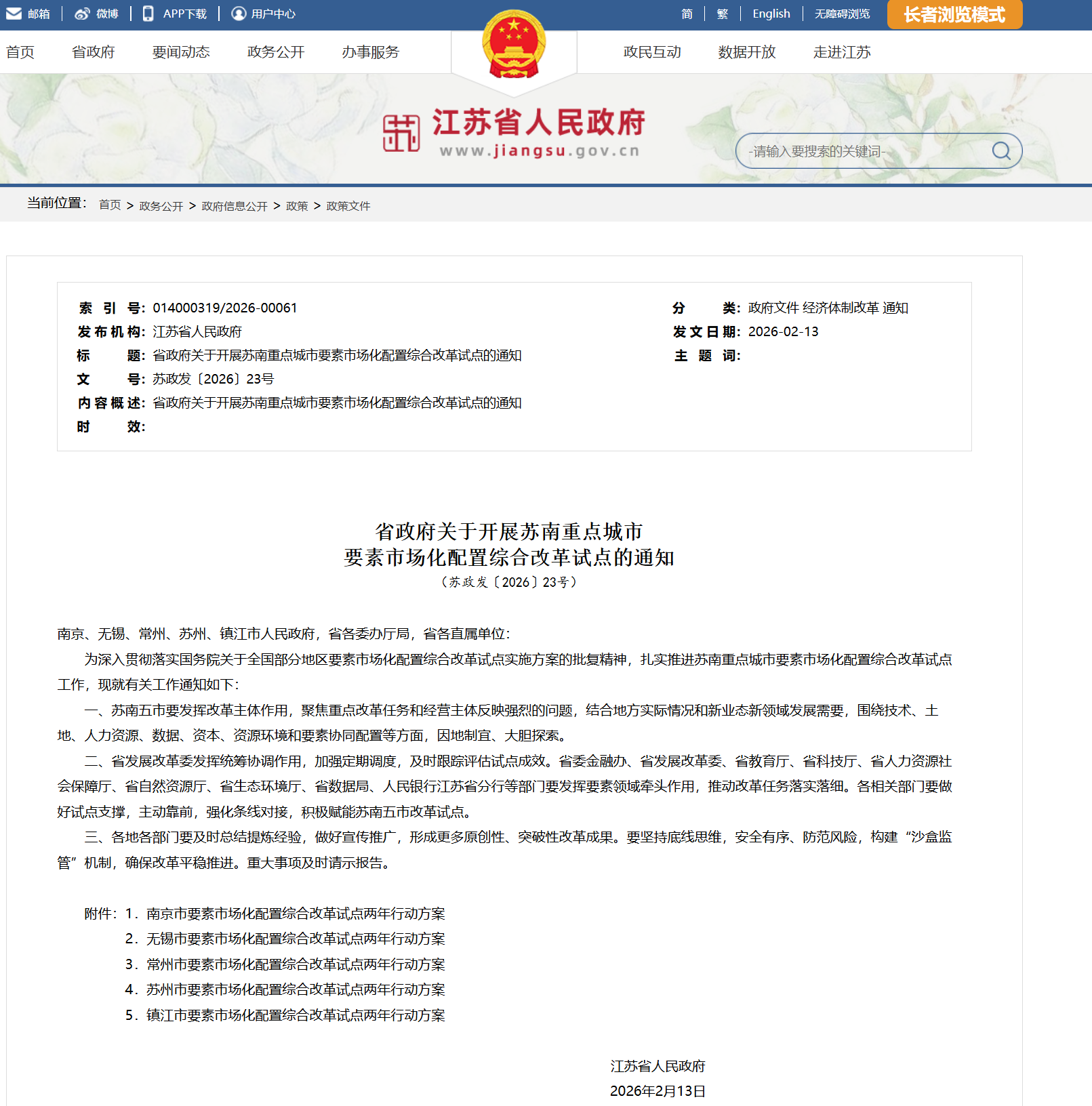 (苏政发〔2026〕23号)