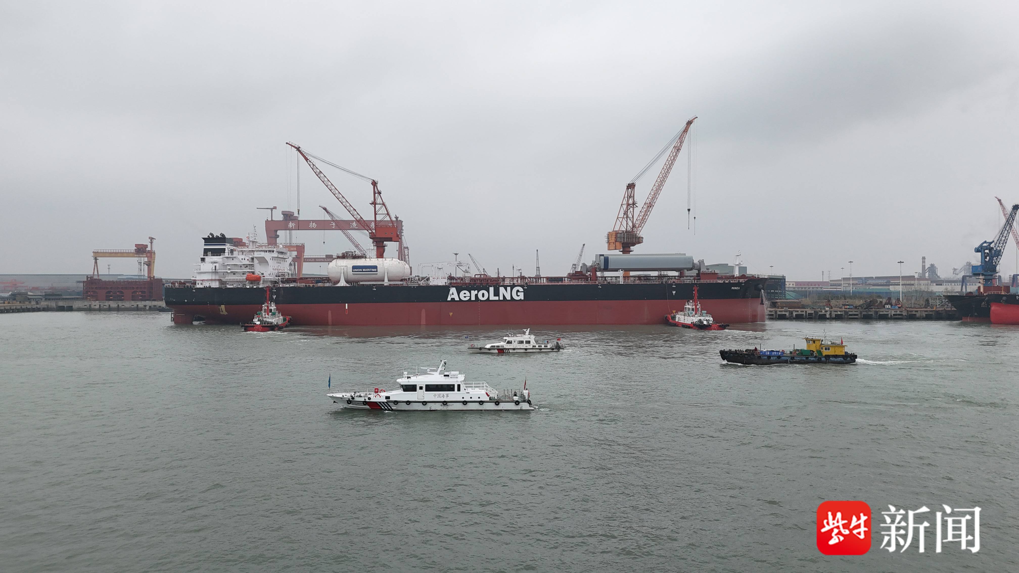 扬子晚报网3月5日讯(通讯员 沈阳 王朵 记者 笪越) 3月5日,在江苏海事部门15艘海巡艇接续护航下,长江干线马年首支超大型新造船舶编队从泰州顺利出江试航。本次编队由江苏新扬子造船旗下“新扬子538”与“新扬子539”组成,整个编队长达2公里,犹如骏马奔腾,气势宏大。
