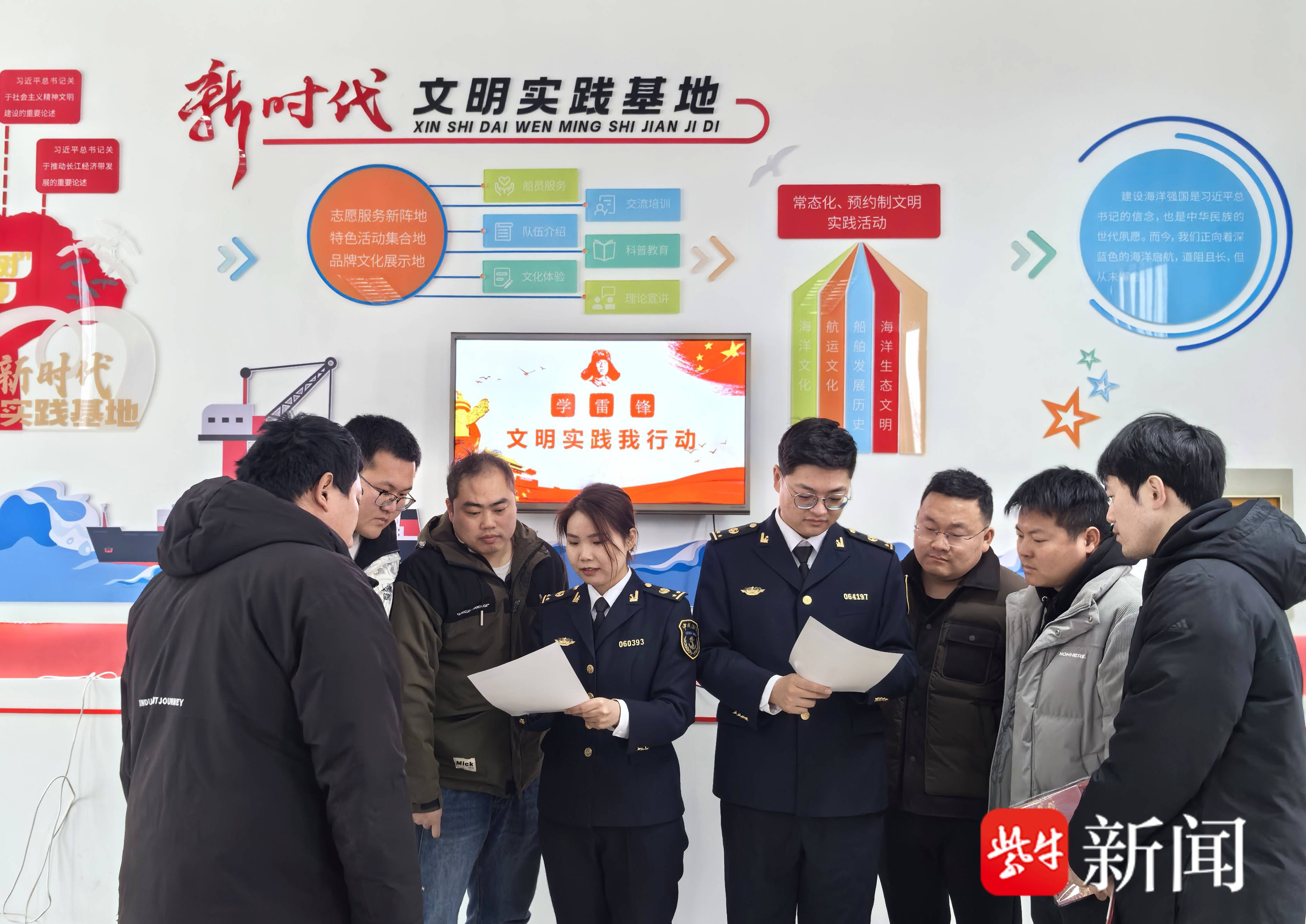 加强法治宣传,让法规意识入人心。在新时代文明实践基地展厅,海事执法人员结合近年来辖区发生的典型违法违规案例,向船员重点讲解海事法律法规在规范航行秩序、保障船员权益、保护生态环境等方面的具体实践,深入剖析违法违规行为的风险隐患和现实危害,增强船员的法治观念,共同维护安全畅通的水上交通秩序。在水工作业现场,海事执法人员开展“送法上船头”志愿服务活动。将《中华人民共和国长江保护法》等法律法规资料送到船员手中。针对施工作业特点,执法人员结合近期典型事故案例,重点宣贯水上施工安全规范、防污措施及应急设备操作要点。既弘扬了新时代雷锋精神,又通过“零距离”普法切实增强了从业人员的安全意识和法治观念