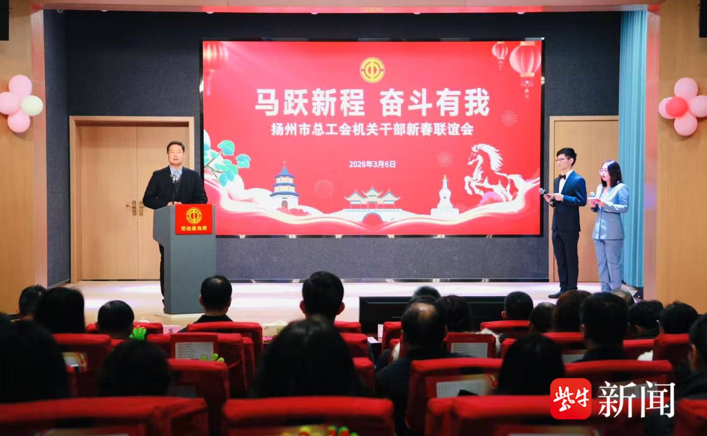 歌曲演唱深情动听,才艺表演专业精彩,事迹宣讲扎实感人。3月6日下午,扬州市中心工人文化宫小剧场气氛热烈。扬州市总工会在这里举办“马跃新程 奋斗有我”机关干部新春联谊会。举办这一活动,激励全体工会干部职工以龙马精神开启新征程,以奋斗姿态书写新篇章,在各自的岗位上跑出加速度、干出新精彩。