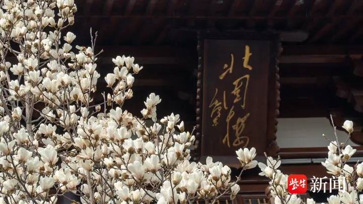 气温回暖玉兰开,镇江北固山古楼映花醉游人