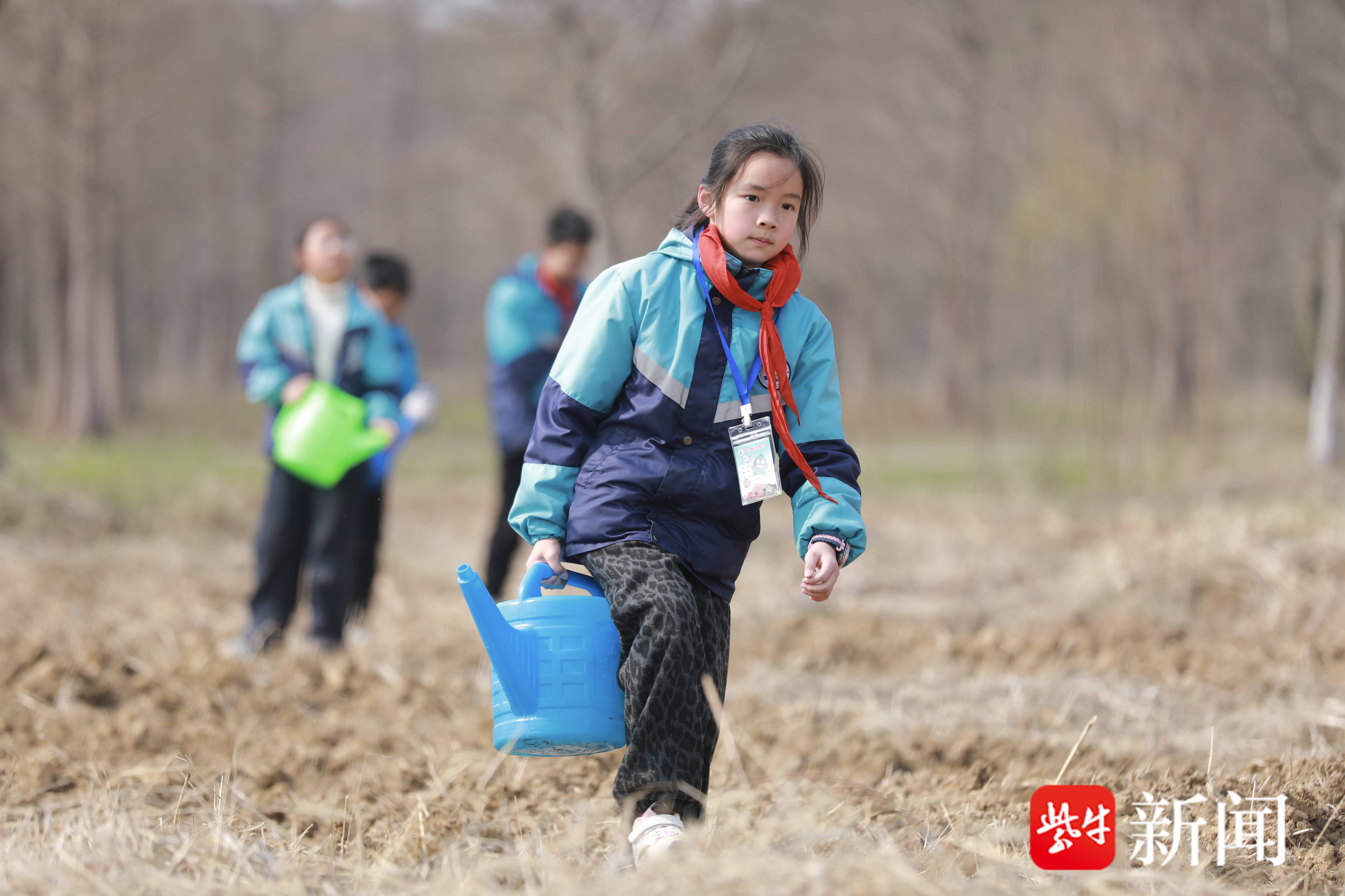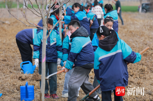 3月11日上午,句容赤山湖国家湿地公园的植树点一派热火朝天的劳动景象。来自句容郭庄镇中心小学的同学们在老师和工作人员的指导下,兴致勃勃地投入到植树劳动中。现场,孩子们分工协作,默契配合,有的小心翼翼地扶正树苗,有的挥动铁锹奋力培土,还有的拎着小桶来回穿梭,为新栽下的树苗浇灌生命之水 。尽管脚上沾满了泥土,额头渗出了汗珠,但每个人的脸上都洋溢着劳动的喜悦和期待。