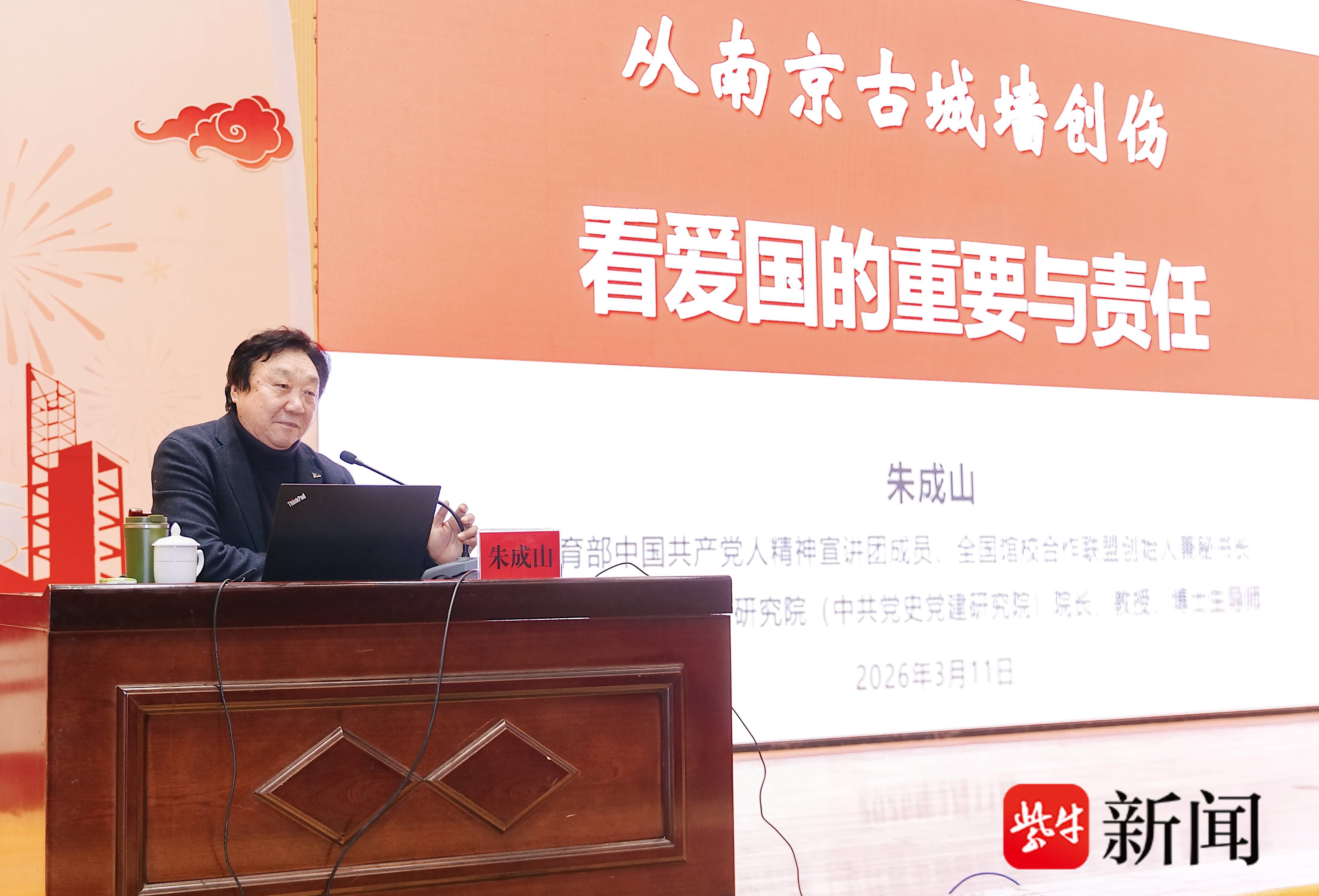 课堂上,光华门、中华门、中山门……一幅幅泛黄的历史照片徐徐展开,清晰呈现出古城门在日军炮火下伤痕累累的模样,将现场师生带入那段风雨如晦的岁月。“日军炮击中华门门垛,从被毁城门缝隙涌入。”朱成山以南京明城墙的历史创伤为切入点,用一个个鲜活翔实的历史案例、一段段真挚深沉的情感表达,带领师生回望民族苦难、铭记历史沧桑,深刻阐释“有国才有家”的厚重内涵与时代价值。他勉励青年学子将爱国情怀内化于心、外化于行,把个人成长坐标锚定在国家发展的宏阔蓝图中,在中国式现代化建设的宏伟征程中奋勇争先、建功立业。
