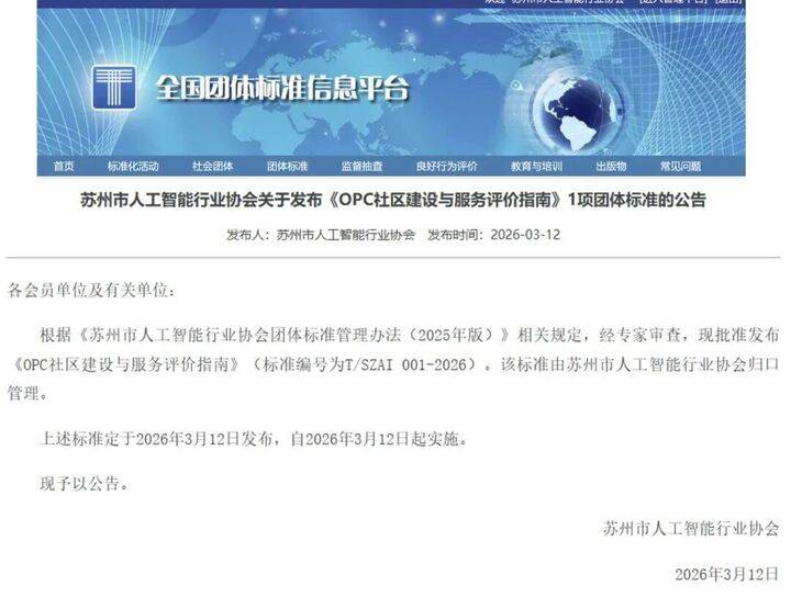 交汇点讯 3月12日,由苏州市人工智能行业协会和苏州市长三角人工智能生态服务研究院共同牵头,联合近40家人工智能相关企事业单位、创业孵化载体机构、高校院所、OPC等共同制定的团体标准《OPC社区建设与服务评价指南》(T/SZAI 001-2026)正式发布并实施。该标准是国内首个针对以“单人+AI”(One Person Company,简称OPC)为核心特征的新型创业模式及其承载社区的系统性规范与评价指南,标志着OPC这一创新业态在规范化、专业化发展道路上迈出了关键一步。