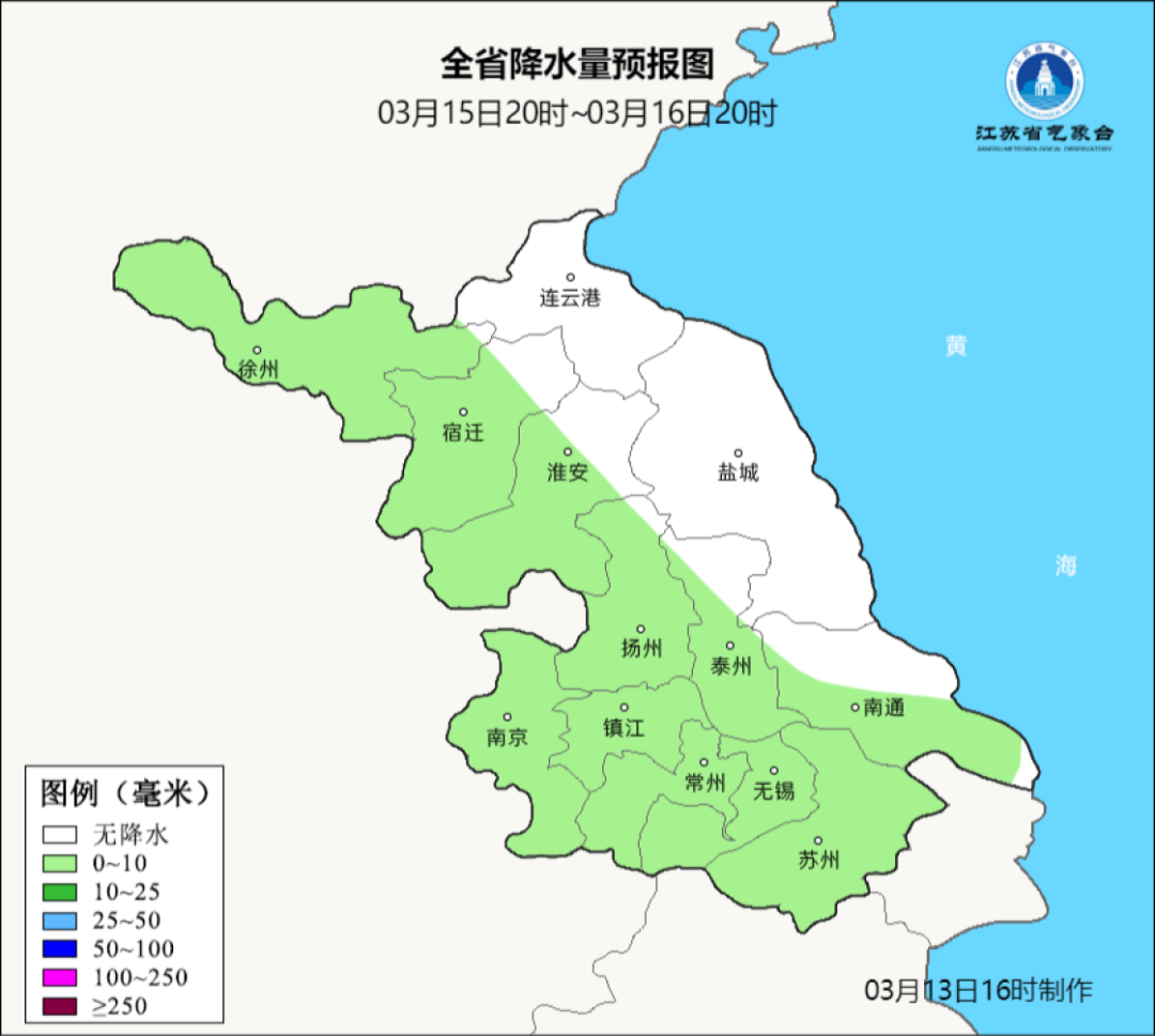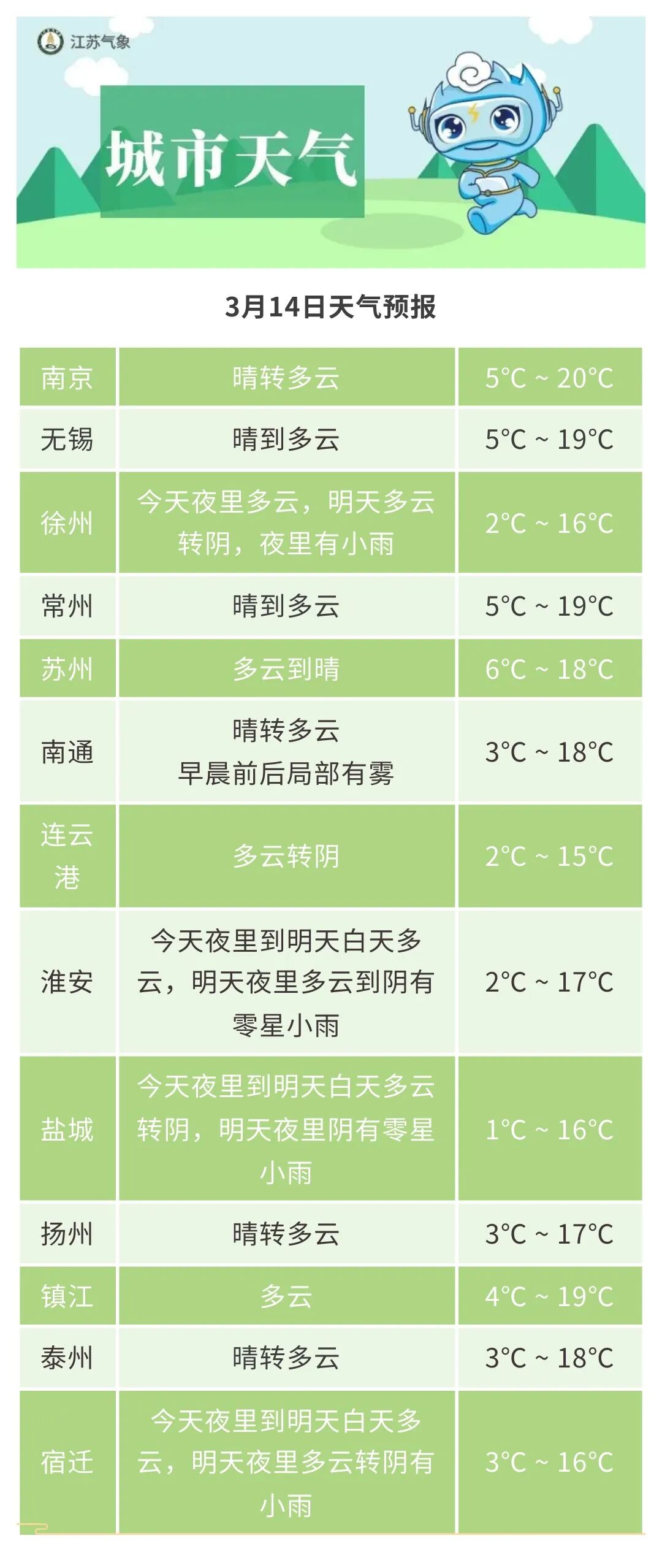淮北地区阴有小雨并渐止转多云;其他地区多云到阴,其中西部地区有时有小雨。最高温度:苏南地区15~16℃,其他地区13℃左右;最低温度:全省6~7℃。全省偏东风转东北风,风力都是4级左右。