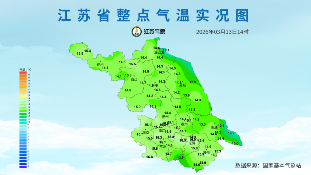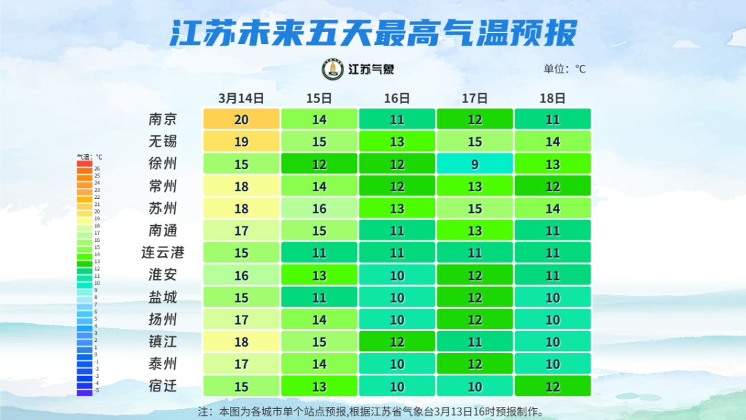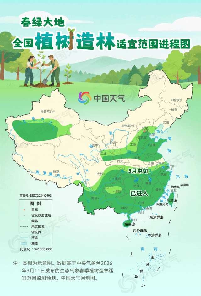 明天气温继续回升,14-15日江苏部分地区有时有小雨|全国植树适宜范围进程图出炉