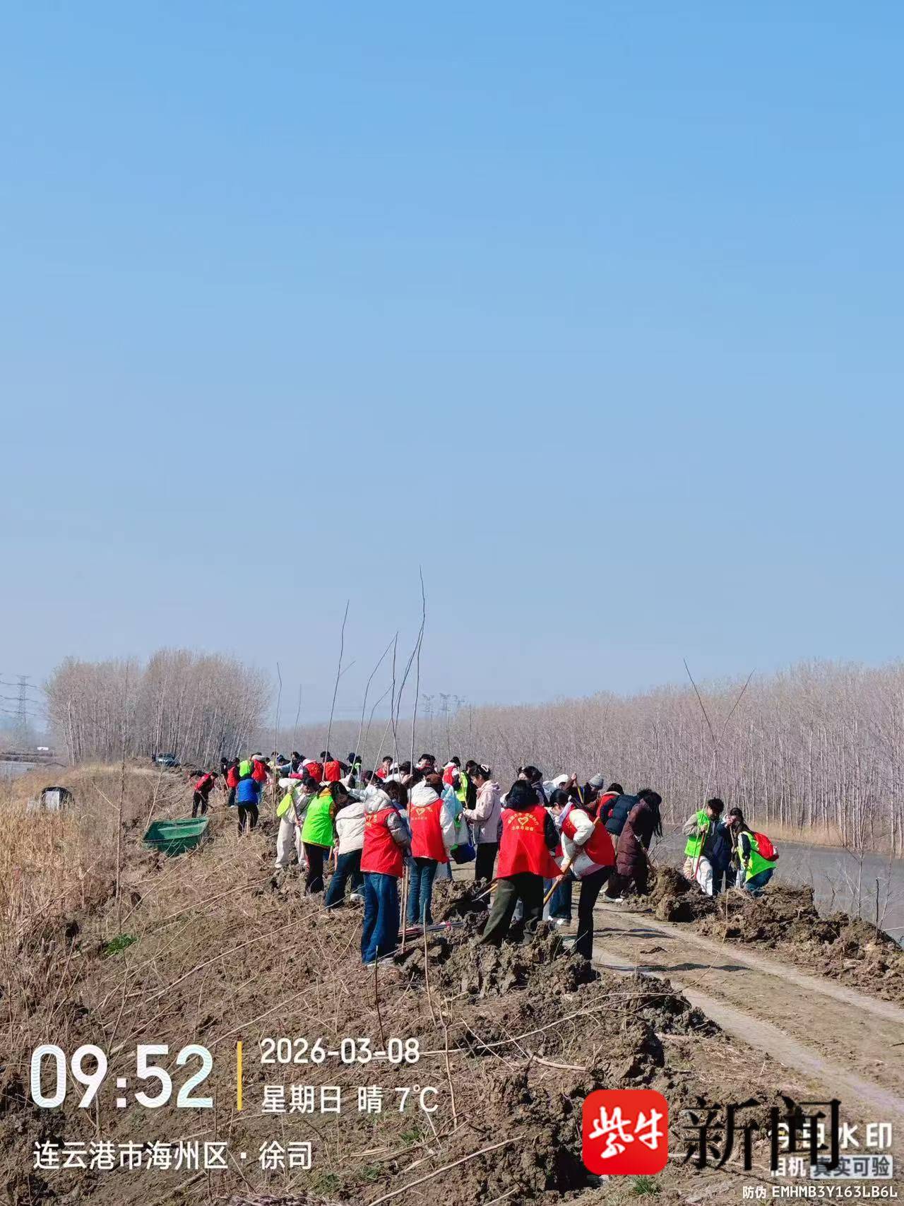 深耕山体绿化的同时,海州区坚持“山水相依”,聚焦水岸生态提升,利用水岸沿线、堤防伐后迹地营造人工林,筑牢护堤护岸生态屏障,完善河流水系林网。日前,在岗埠农场马河南北堤绿化现场,志愿者们忙着栽种无絮杨。与传统杨树相比,无絮杨不仅生长快、适应性强,还能有效解决飞絮污染问题,兼顾生态与民生效益。一株株新栽的树苗整齐排列,沿着河堤蜿蜒延伸,形成一道错落有致的“绿色长廊”,为水岸生态筑牢坚实防护屏障。今年该区计划完成220亩沟渠绿化、300亩新沭河河堤绿化,通过科学搭配树种,实现生态防护与景观提升双赢。