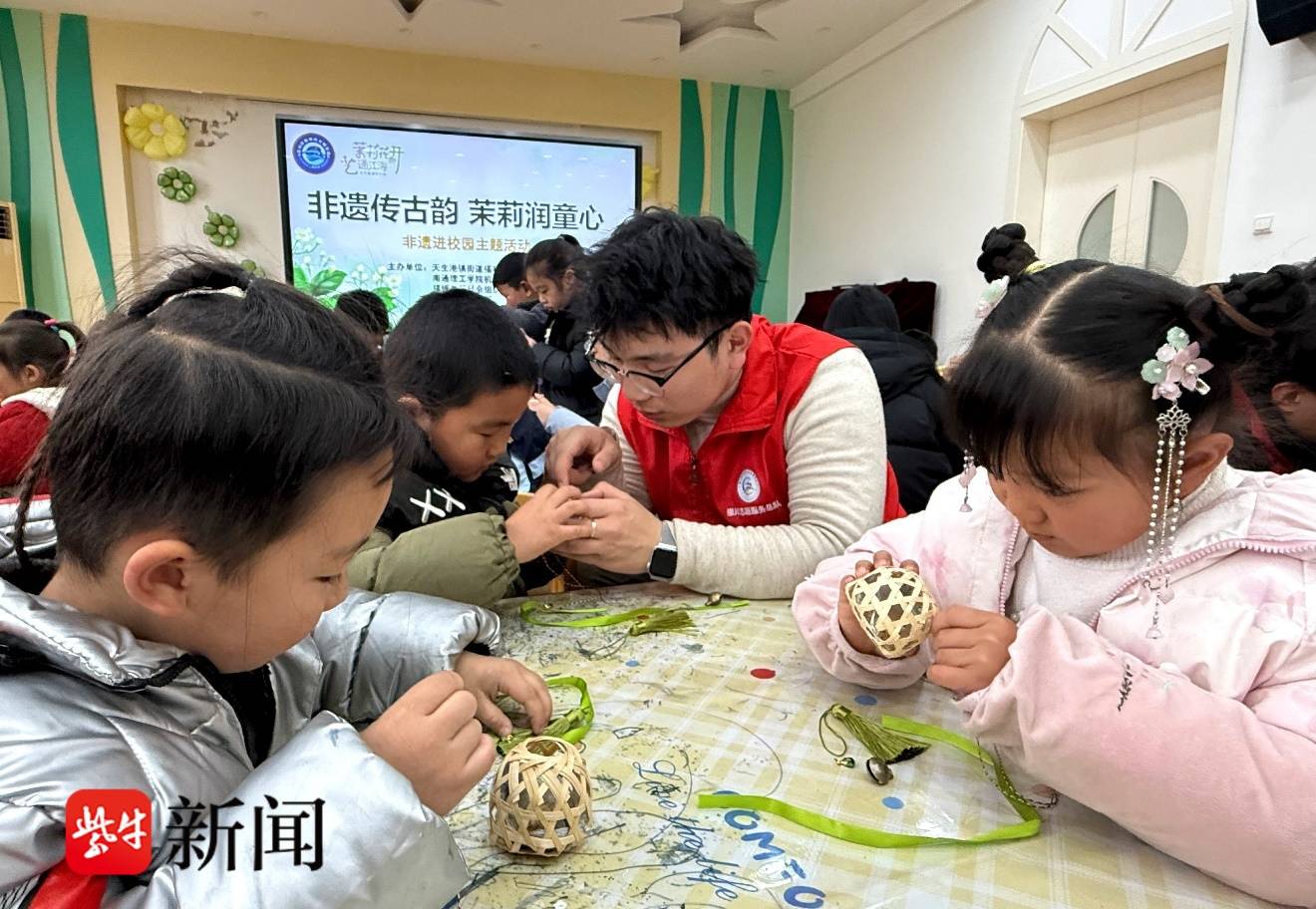 春风送暖,非遗传情。为了弘扬中华优秀传统文化,丰富辖区青少年儿童的精神文化生活,3月11日,南通市崇川区天生港镇街道福利社区、龙潭社区新时代文明实践站、社会工作服务站、工会、妇联、关工委、团总支联合南通理工学院金陵六合寻艺团开展了“非遗传古韵 茉莉润童心”文化进校园主题活动,以学唱童谣、绘本阅读、竹编体验为载体,让孩子们近距离感受传统非遗文化的魅力。