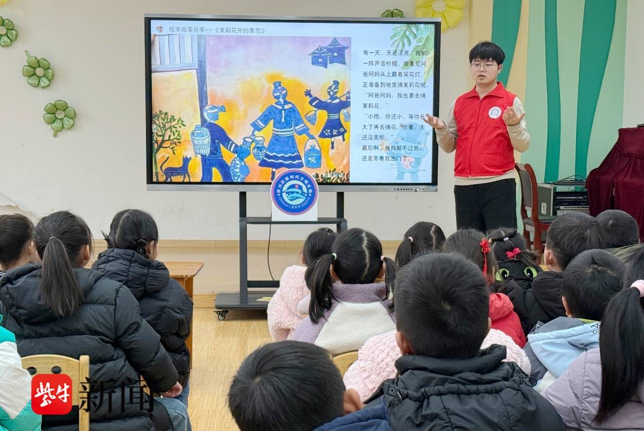 绘本读非遗,趣味学知识。阅读推广志愿者王子赫为孩子们带来了绘本分享《茉莉花开的季节》,他用简单而生动的语言,结合绘本中茉莉花海、乡村生活的生动画面,以孩子的视角,讲述了六合茉莉花民歌的由来及冶山农民画的乡土故事,每一幅画都像是从土地里生长出来的,带着泥土的芬芳和生活的温度,随着故事情节推进,仿佛将大家带到那个充满茉莉花香的小村庄。分享中不仅展现了乡村的风貌变化,还将“花香”与“互助精神”结合,让孩子们在阅读中感受自然的美丽和生活的温暖,构建了一个理想的乡村生活图景。