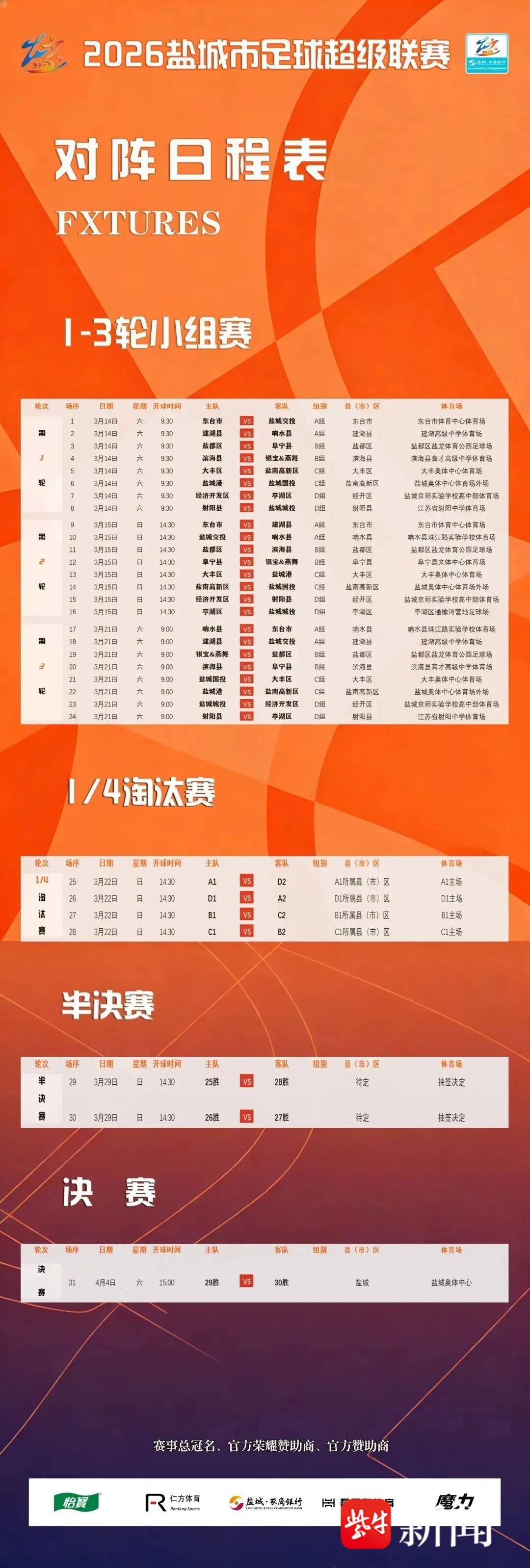 3月14日上午,2026盐城市足球超级联赛小组赛首轮全面打响,盐城地区16支队伍展开激烈角逐。各赛区比赛刚刚结束,完整赛果如下: