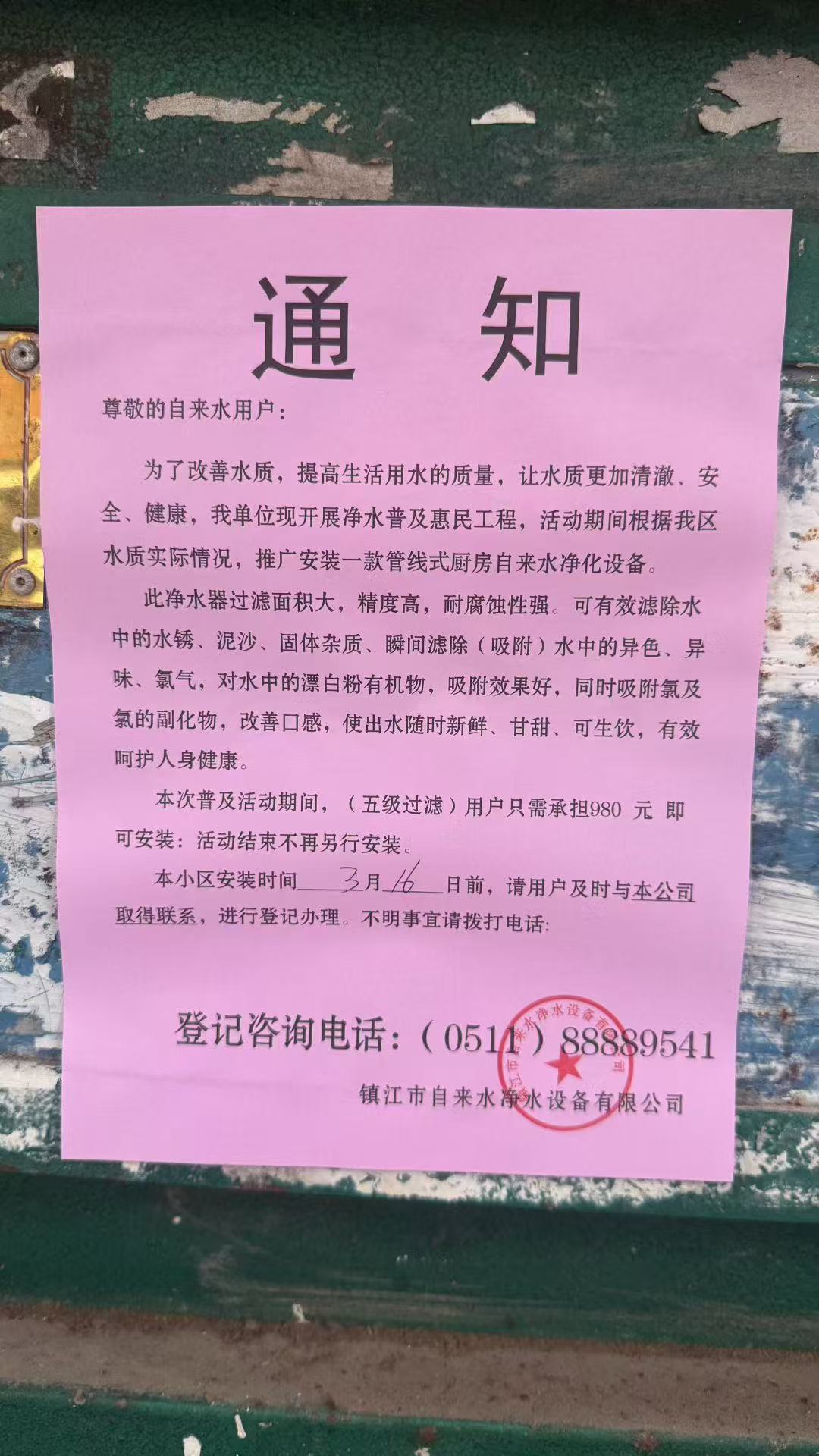 扬子晚报网3月17日讯(记者 万凌云 姜天圣)近日,有镇江市民向扬子晚报/紫牛新闻记者反映称,自己家门口被贴上“镇江市自来水净水设备有限公司”的通知,通知称,“为了改善水质,提高生活用水的质量,让水质更加清澈、安全、健康,我单位现开展净水普及惠民工程,活动期间根据我区水质实际情况,推广安装一款管线式厨房自来水净化设备。此净水器过滤面积大,精度高,耐腐蚀性强。可有效滤除水中的水锈、泥沙、固体杂质、瞬间滤除(吸附)水中的异色、异味、氯气,对水中的漂白粉有机物,吸附效果好,同时吸附氯及氯的副化物,改善口感,使出水随时新鲜、甘甜、可生饮,有效呵护人身健康。”