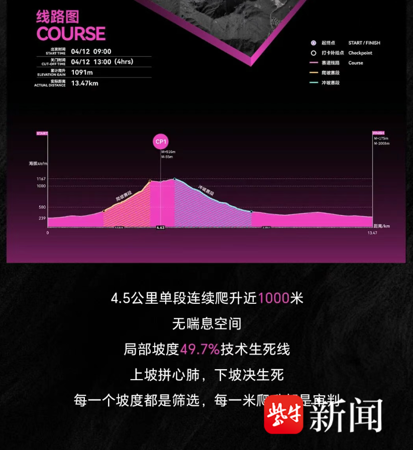 本次赛事以 “坡是越野跑的精华,爬升是决胜的关键,下坡是技术的试炼” 为核心主张,回归越野本质,重塑爬升标准,被称为 “坡王诞生的唯一战场”。湖州站赛道全长 13.47 公里,累计爬升 1091 米,平均坡度 19.8%,局部坡度更是突破 49.5%,其中 4.5 公里单段连续爬升近 1000 米,几乎无喘息空间,对选手的心肺耐力与爬坡技术提出极致考验。赛道拆解为爬升、陡升、下降、冲刺四个阶段,分别对应 “稳输出蓄能量”“敢发力拉差距” 等战术要求,让每一次攀登都成为对极限的挑战。