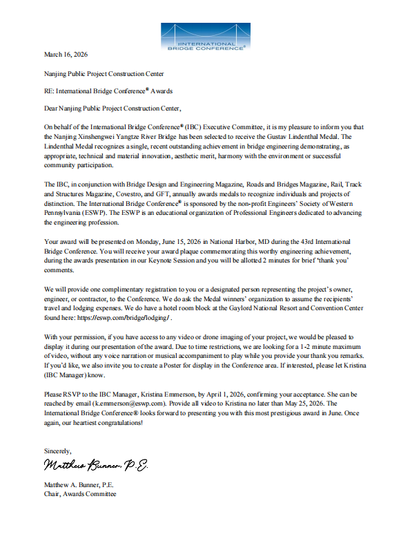 近日,从国际桥梁大会组委会传来喜讯,中铁宝桥扬州公司参建的南京新生圩长江大桥荣获2026年国际桥梁大会(简称IBC)古斯塔夫·林德撒尔奖。