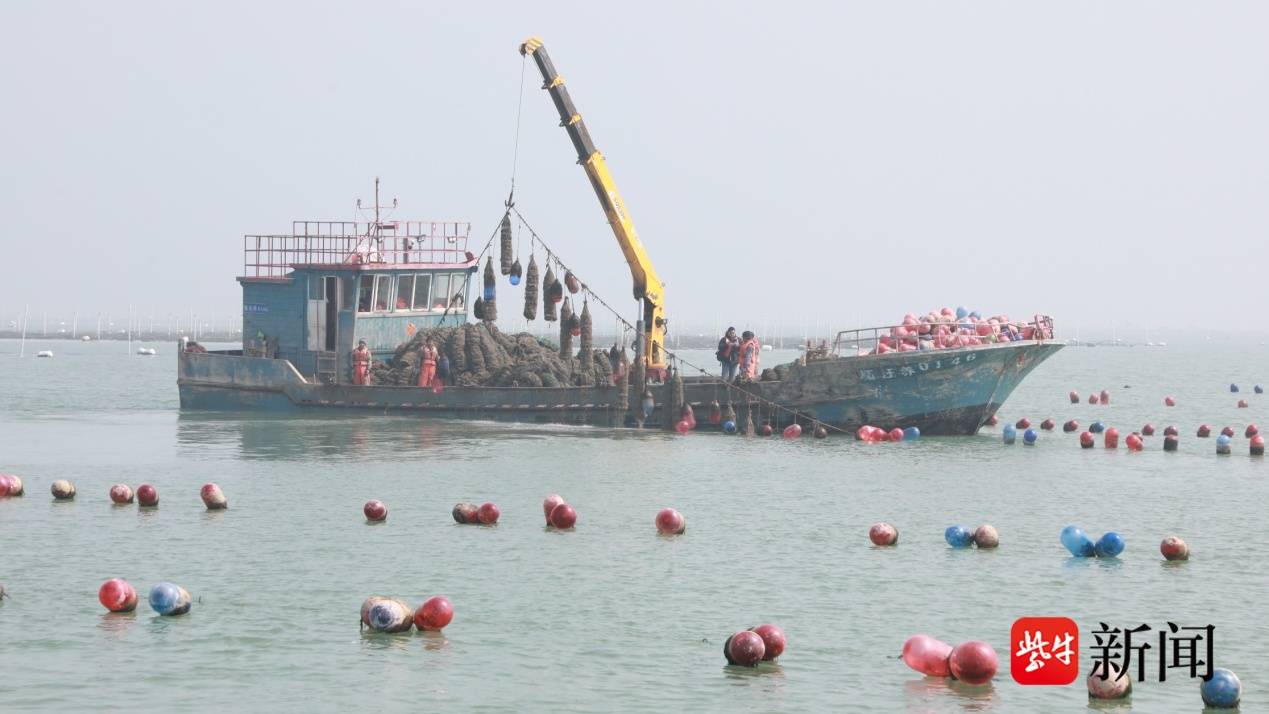 近年来,赣榆区海头镇依托优越的海域资源,大力发展生蚝养殖产业,逐渐形成规模化、集群化发展的“生蚝经济”。目前,当地生蚝年产量约17万吨,年产值稳定在17亿元左右,不仅带动了3000多人直接就业,还推动电商、冷链物流、海产品加工等相关产业协同发展,让鲜美的“黄海生蚝”源源不断走向全国各地。 与此同时,在秦山岛附近海域,另一片“海上菜园”同样迎来收获时刻。成片的紫菜养殖带在海面上随波起伏,远远望去宛如一条条绿色丝带。养殖户驾驶收割船在养殖区间穿行,将鲜嫩的紫菜卷起收割、装船,忙碌而有序。