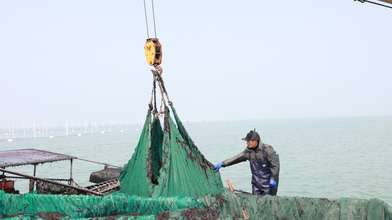 目前,黄海海域的生蚝、紫菜相继迎来收获季。养殖船来回穿梭,工人们熟练地将沉在海中的蚝绳缓缓拉起,一串串沉甸甸的生蚝带着海水被拖出水面,在阳光下泛着淡淡的光泽。大家分工协作,分拣、装筐、搬运,一气呵成,船舱很快被装得满满当当,海面上到处洋溢着丰收的喜悦。