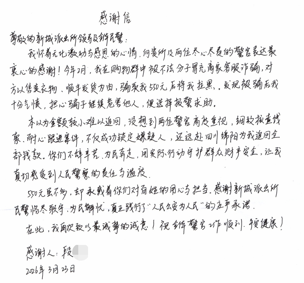 “本以为被骗金额不大,这笔钱大概率追不回来了,没想到警官们这么重视,细致核查每一条线索,全程耐心跟进案件,还远赴四川绵阳帮我拿回全部钱款……”拿到失而复得的钱款,段女士激动万分。这封手写感谢信,没有华丽的词藻,没有刻意的修饰,却承载着群众对公安民警最真挚、最质朴的认可与感激。