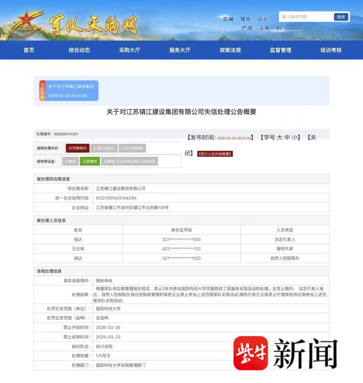扬子晚报网3月26日讯(记者 万凌云 姜天圣)26日,根据“军队采购网”的公开信息,江苏镇江建设集团有限公司因为围标串标,被国防科技大学采购管理部门处罚: