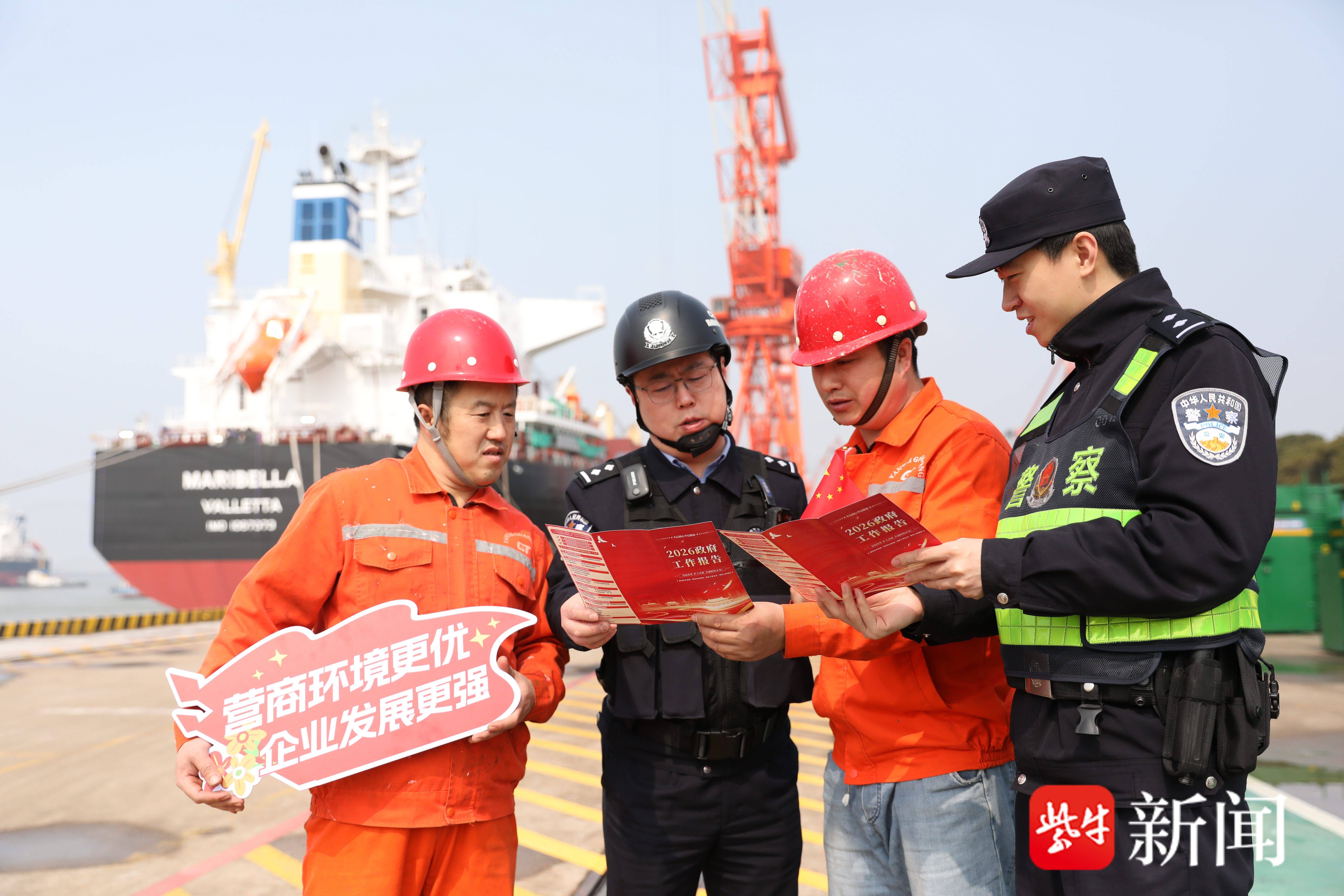 “2026年政府工作报告围绕高质量发展作出部署,明确提出要统筹高质量发展和高水平安全。咱们港口是经济发展的前沿阵地,物流更畅通、口岸更安全、服务更高效,背后都离不开高质量发展的要求。”3月19日,在南通边检站与长航南通公安南通派出所联合开展的“两会精神进港区”活动现场,宣讲民警张银熔手持宣传手册,结合港区生产生活实际,用通俗易懂的语言解读全国两会关于高质量发展、民生保障、安全生产、交通物流等方面的重要部署。“原来两会精神离我们并不远,和我们的工作、生活都息息相关!”听完宣讲后,一名船员感慨地说。