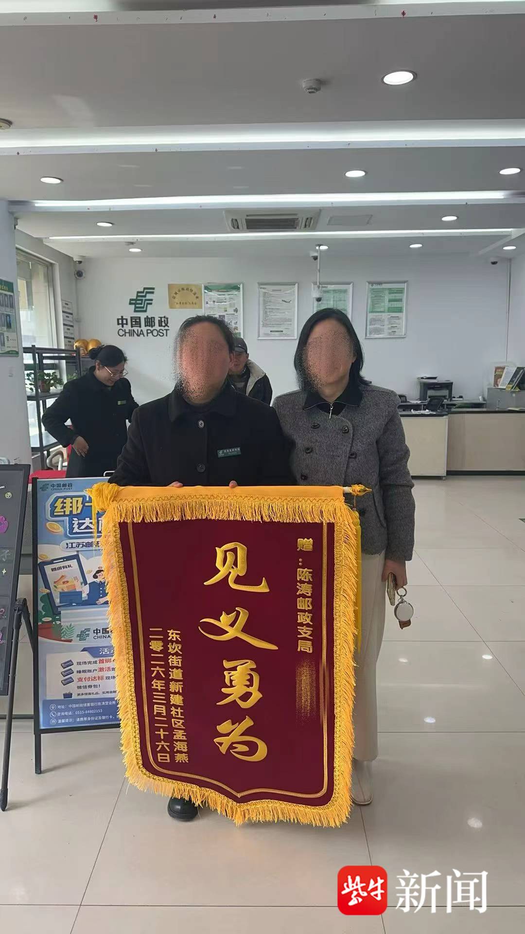 盐城滨海邮政员工见义勇为获群众赠旗