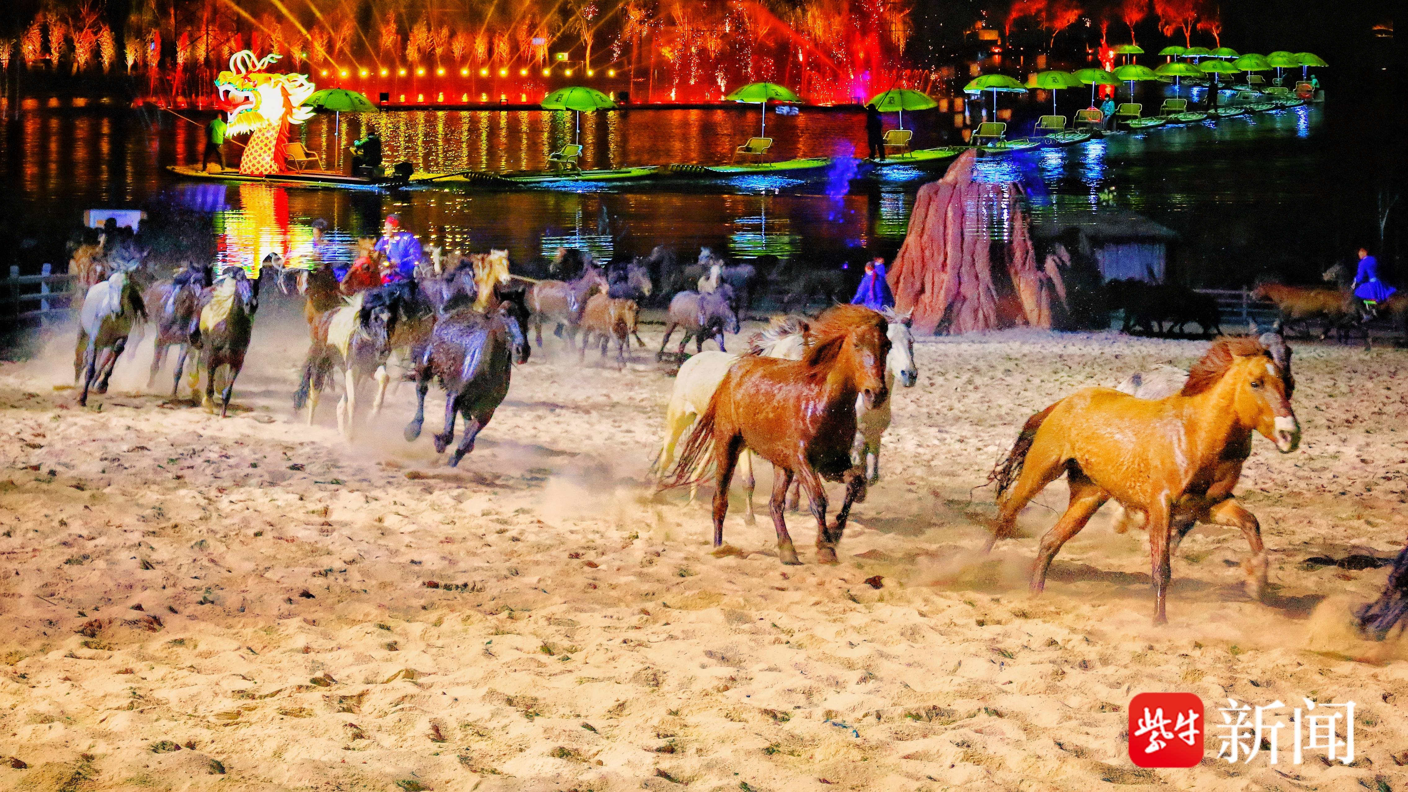 新版夜间演出在保留骏马踏河、策马套马等经典震撼场面的基础上,进行了全方位升级,重磅融入西域风情、铁花飞溅等全新篇章,并新增水上金龙巡游、民族斗舞、飞马火壶等诸多亮点。