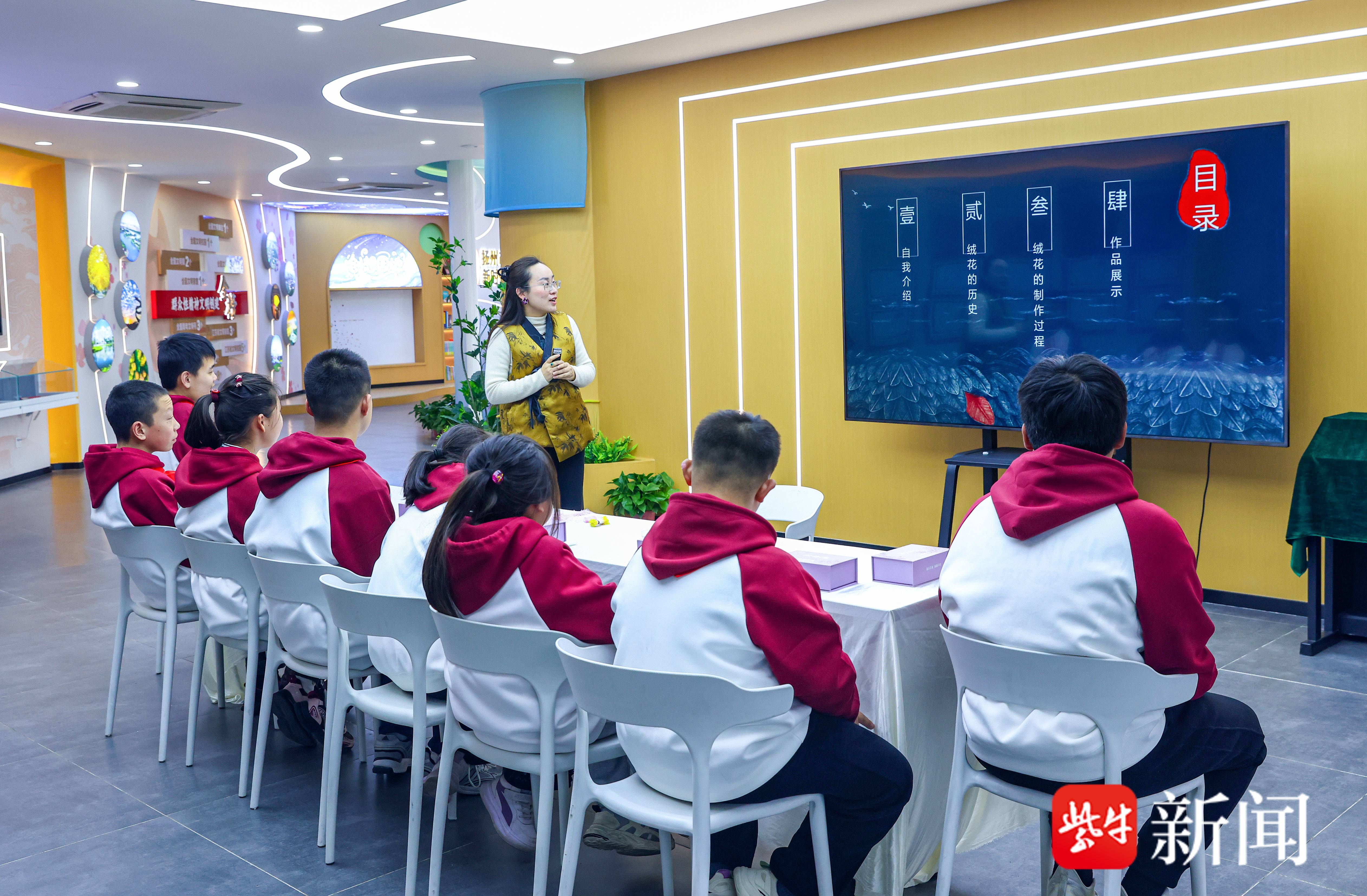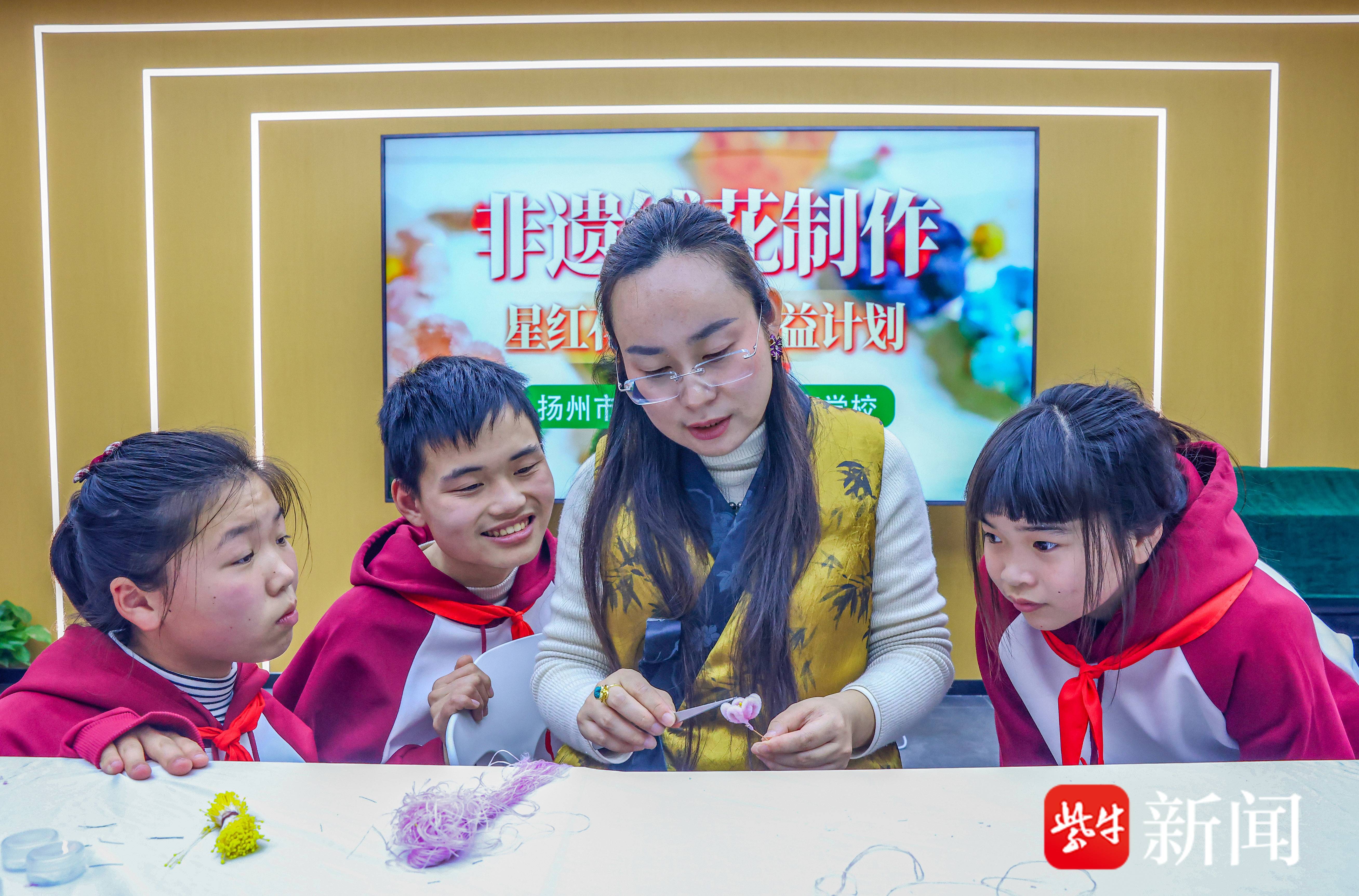 3月31日,扬州市江都区特殊教育学校学生代表走进江都区新时代文明实践中心,开展非遗绒花制作主题体验活动。