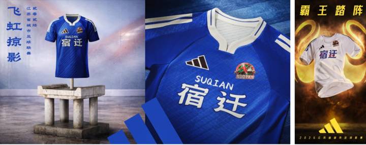 主场比赛服漾洋河清蓝,斜纹如运河奔涌,承漕运重镇千年文脉,绘今朝新城气象;客场比赛服凝项羽气概,脸谱写意传神,蕴西楚英豪浩然之气,绽绿茵赛场万丈锋芒。一脉酒韵铸城魂,飞虹掠影,霸王踏阵。