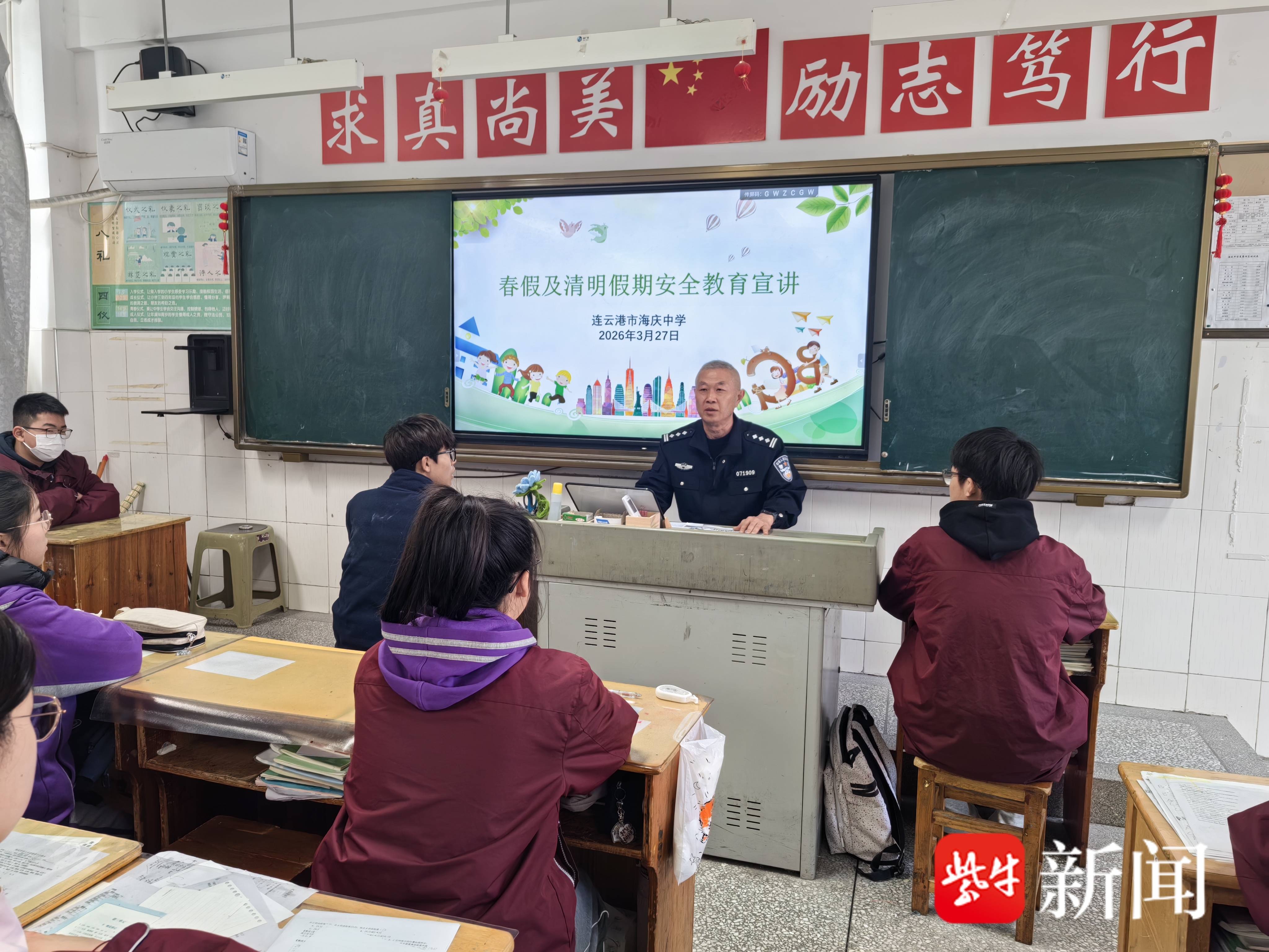 “同学们,假期出行、居家生活、清明祭扫,每一个安全细节都不容忽视,外出时别忘了带点消毒液和创可贴,以防碰伤、擦伤……”3月27日上午,“州到守未”专项民警贴心地走进连云港海庆中学,开展春假及清明节期间安全专题讲座。