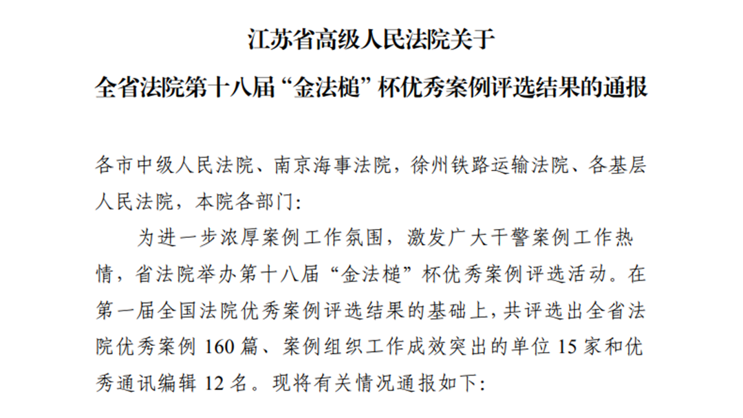 丹徒法院一案例获得江苏省法院第十八届“金法槌”杯优秀案例