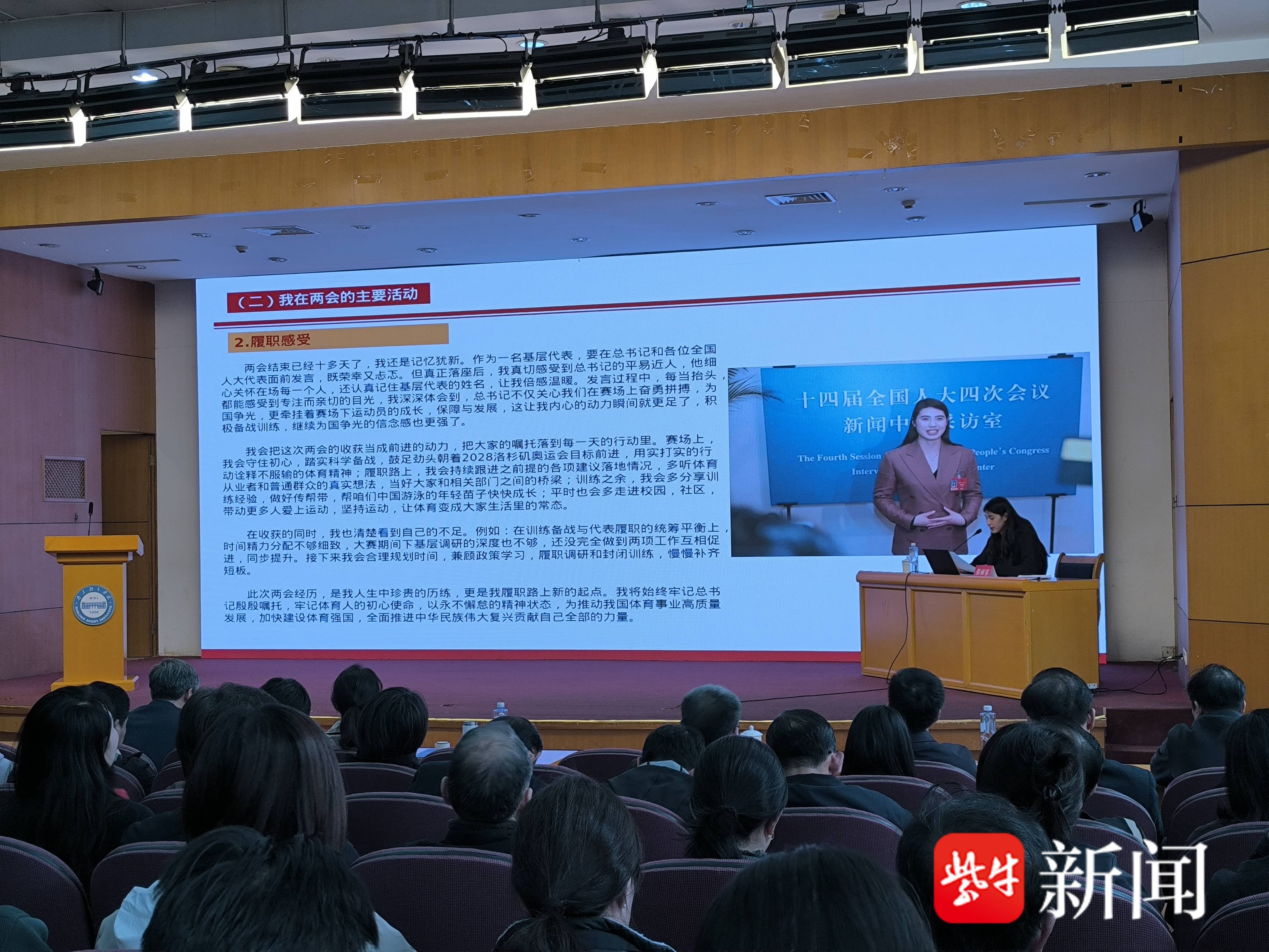 今年全国两会期间,全国人大代表、南京体育学院游泳学院副院长张雨霏向习近平总书记汇报了自己征战三届奥运会的奋斗历程。3月31日,她在南京体育学院向该校师生宣讲两会精神、分享履职感受,并接受记者采访。