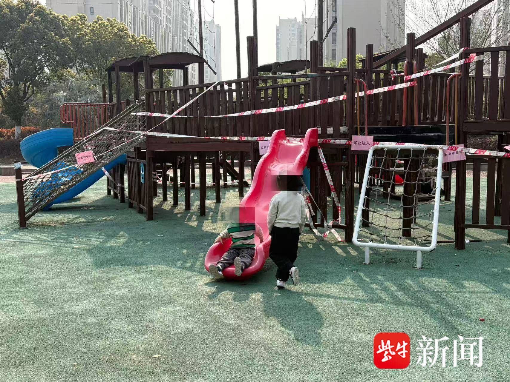 扬子晚报网4月1日讯(记者 万凌云 姜天圣)近日,有镇江市民向扬子晚报/紫牛新闻记者反映称,位于镇江市润州区的万科法治文化公园的儿童设施,存在年久失修、有安全隐患等问题,自己多方反映遭遇“踢皮球”。3月31日,记者前往调查发现,该市民反映的问题基本属实,然而,记者调查同样遭遇多方“踢皮球”。3月31日,紫牛新闻《镇江润州一公园儿童设施年久失修还发生过儿童跌落,社区称无权管理,记者调查遭多方“踢皮球”》发出后引起多方重视。4月1日,记者再次前往现场时设备已被暂时警戒线拦起,还贴有“禁止入内”的告示,但仍有孩童在这些设备上玩耍。