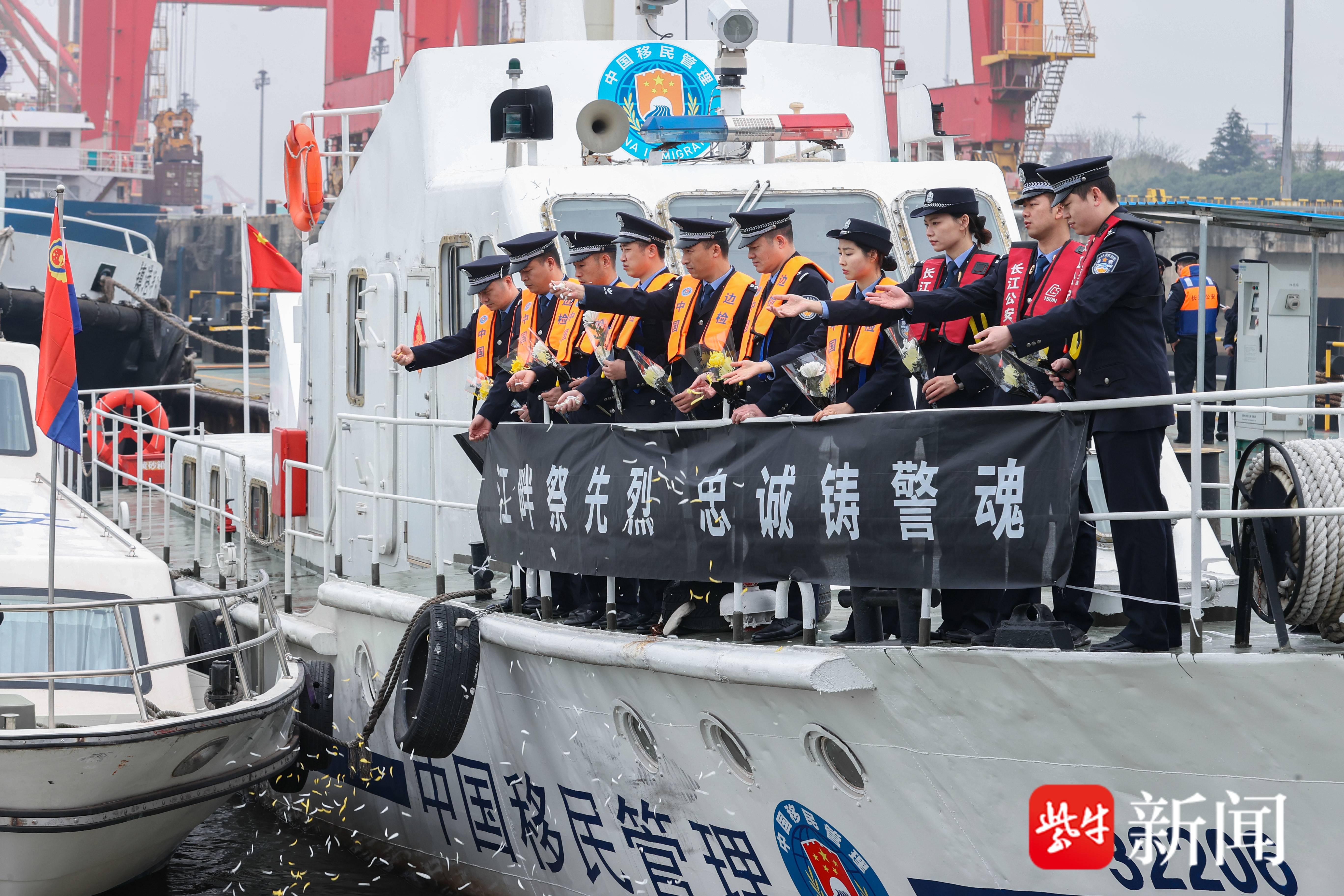 活动开始,民警们重温入党誓词,铿锵誓言在江面上回荡,一字一句坚定有力,彰显着对党忠诚、为民奉献的初心使命。伴随着江风轻拂,寄托哀思的花束缓缓撒向江面,点点漂流,仿佛将敬意与思念送往远方。通过“江祭”这一庄重形式,民警们在特殊的空间场景中接受了一次深刻的精神洗礼。