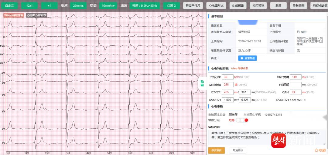 29日当天,一位村民因心悸乏力来到村卫生室就诊。村医立即使用该市卫健委统一配备的便携式智能心电仪为患者采集心电图。仅仅几分钟,高邮市人民医院“心电一张网”心电诊断中心的屏幕上便弹出了这份来自基层的紧急数据。医院值班医生远程审阅后发现,患者的心电图显示为三度房室传导阻滞——这是一种极为严重的缓慢型心律失常,意味着心脏电信号完全“断联”,随时可能发生晕厥甚至心源性猝死,病情刻不容缓。