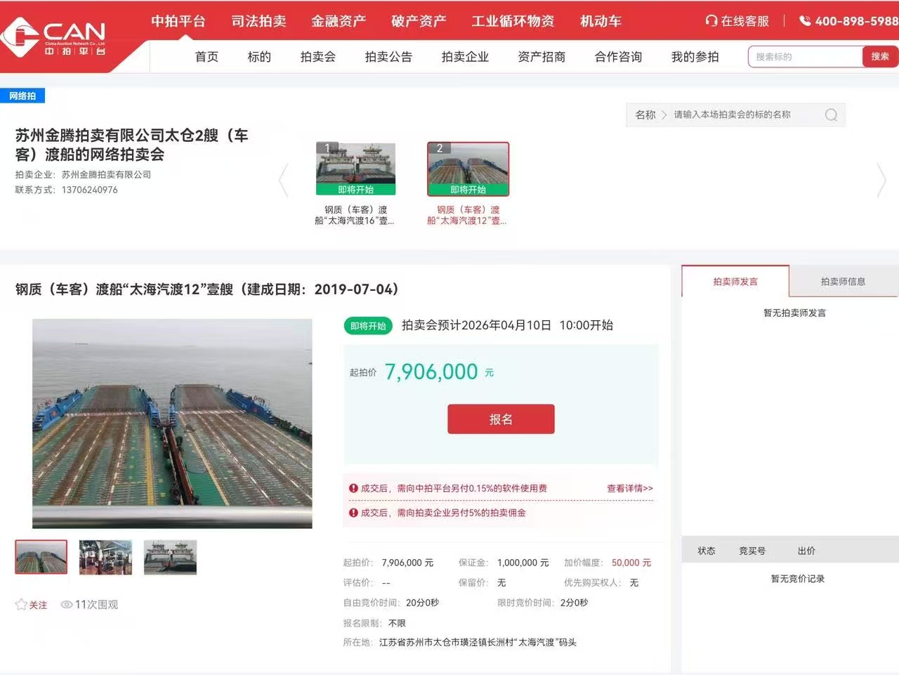 中拍平台挂出两艘“太海汽渡”渡船拍卖
