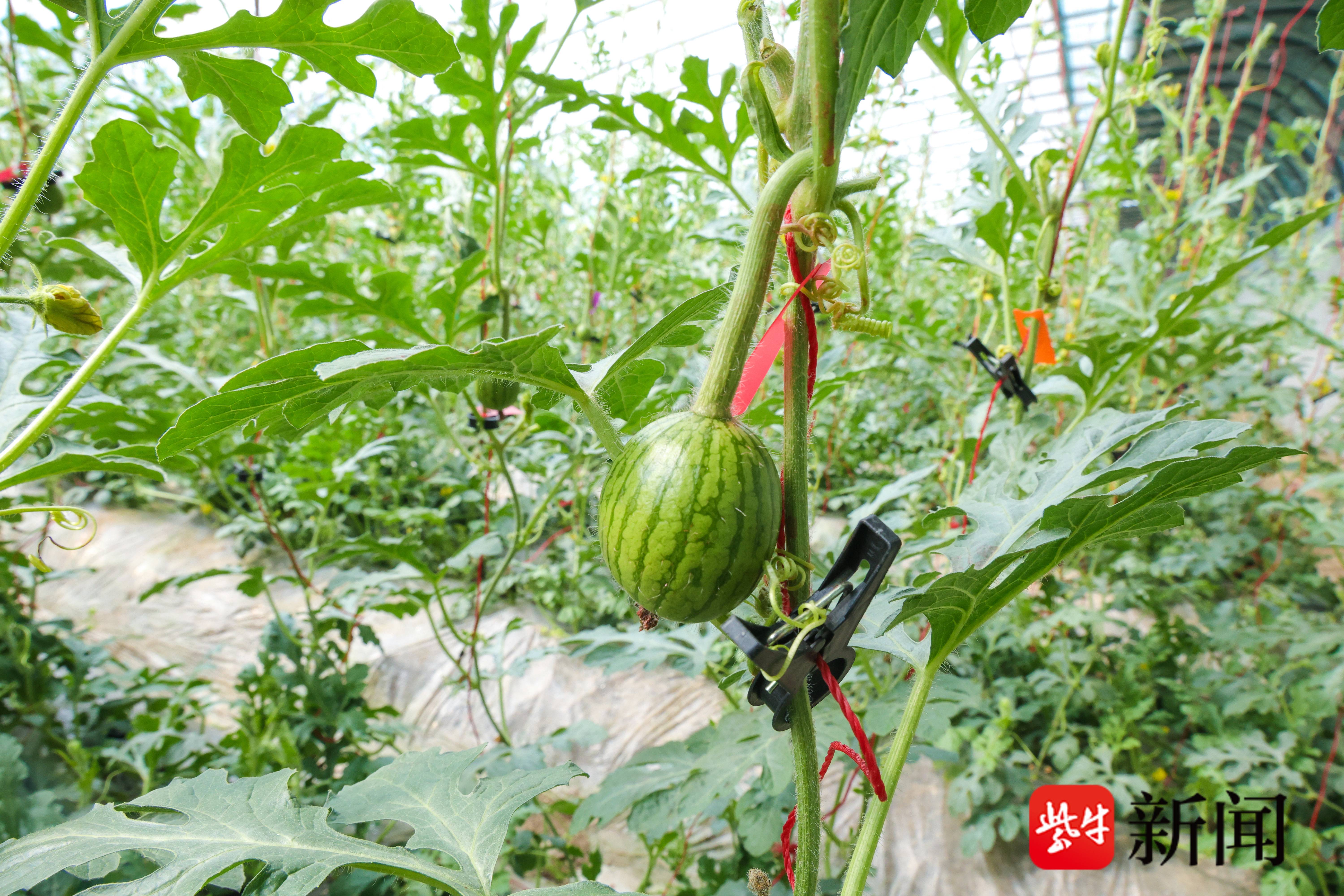 在种植密度上,基地也做了科学调整。去年每个瓜棚种植2000株吊蔓西瓜,今年增加至2100株。传统的爬地种植模式,每亩仅能种植700株;吊蔓种植的株数已是原先的3倍,土地利用率大幅提升。