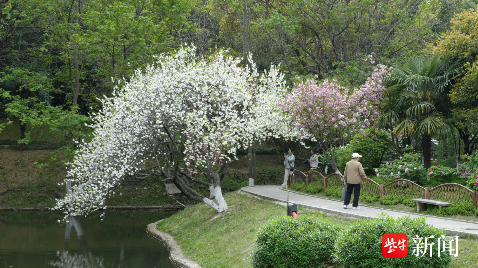 扬子晚报网4月9日讯(通讯员 纪安璐 记者 姜天圣)四月的镇江南山文苑景区春意正浓,百花竞放,宛如一幅层次分明的春日画卷。白色的千瓣白桃、蝴蝶花清雅素洁,红色的晚樱与牡丹热烈绽放,紫藤垂挂如瀑,柳树新绿摇曳生姿,吸引众多市民游客前来踏青赏花。