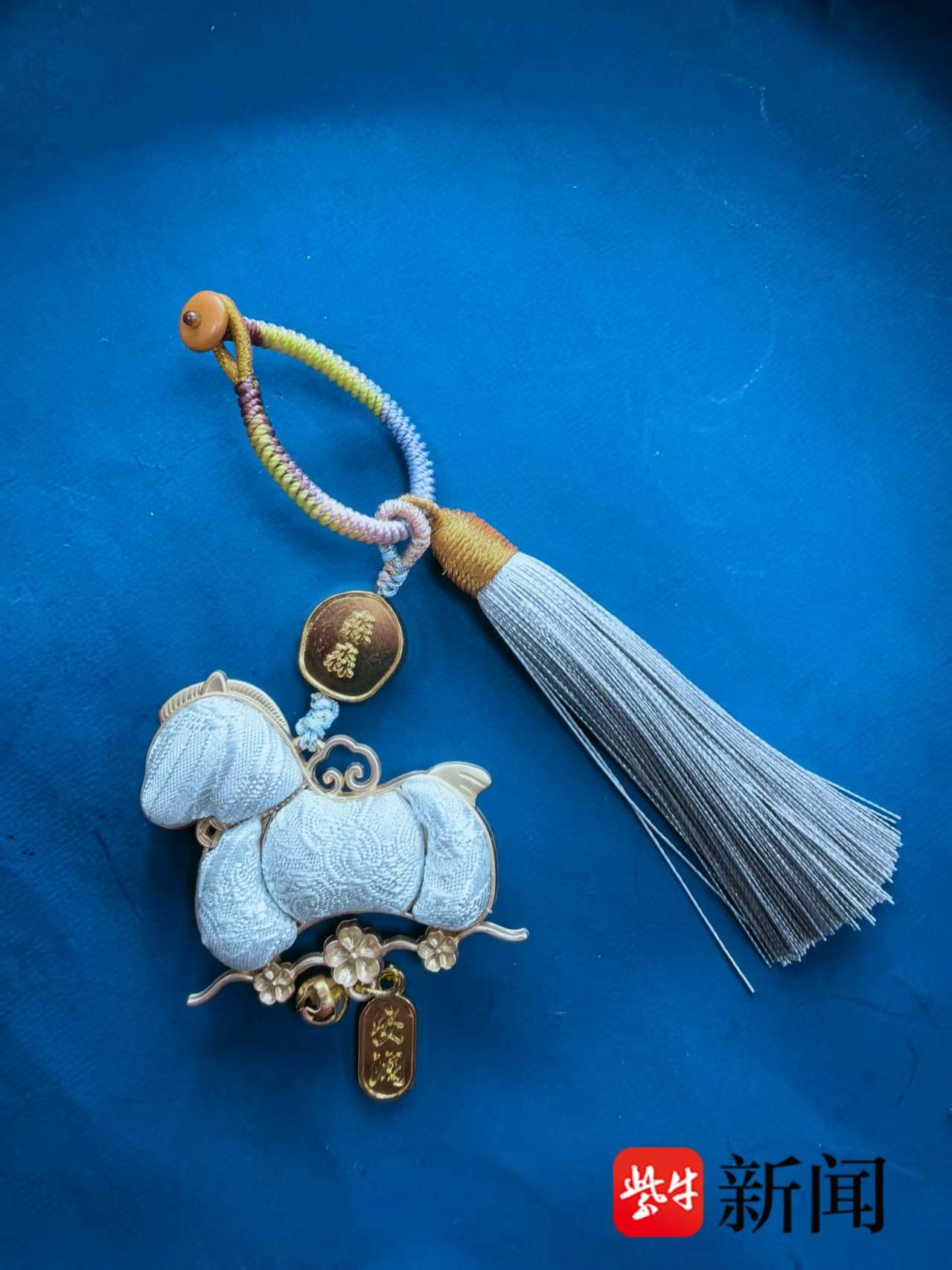 设计细节处处彰显淮安特色与西游文化:宋锦小马马背点缀金色祥云,纹样取自孙悟空头戴紧箍图案,呼应西游主题,传递敢闯敢拼的精神。作品还融入周恩来总理相关元素:金色通孔处的红色大鸾鸟,取自总理乳名“大鸾”,象征总理精神引领淮马奔跑向前;小马脚踏金色海棠,以西花厅海棠为原型,搭配波浪造型,尽显淮水奔腾之美。
