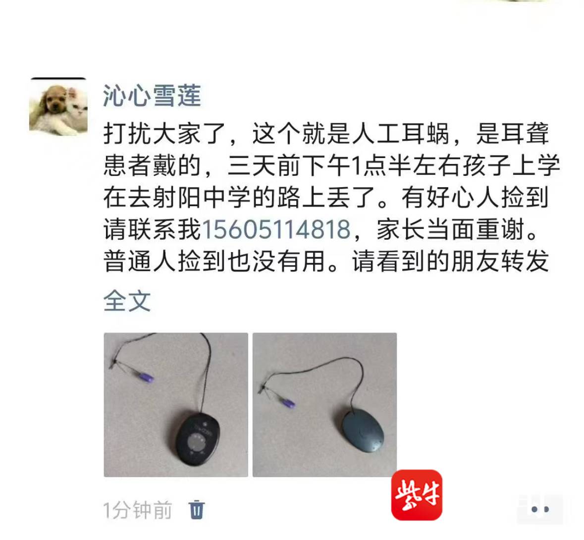 紧急求助!盐城射阳一学生丢失人工耳蜗外机,全家急盼归还