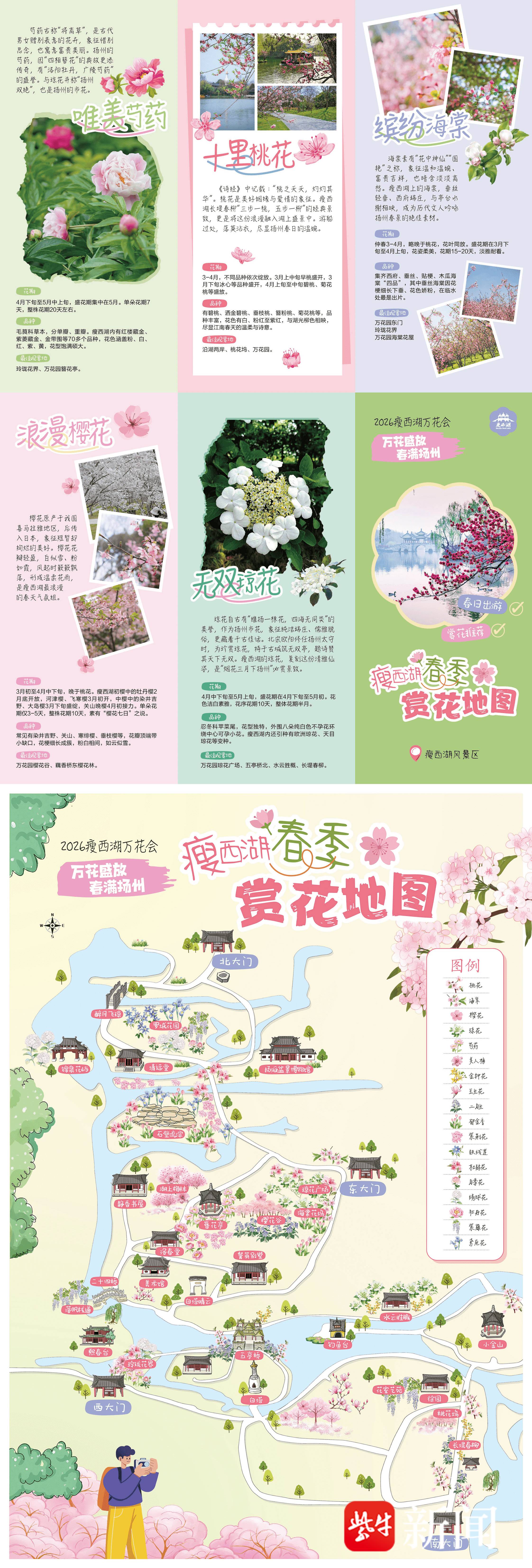 记者采访获悉,为进一步优化游客赏花体验,地图整体采用卡通手绘风格,将五亭桥、白塔、二十四桥等标志性建筑融于花海动线。无论是漫步长堤还是乘船游湖,都能精准找到赏花秘境。同时,地图详细介绍了主题花卉的花期、品种与最佳观赏地,内容丰富详实,风格优雅可爱,既是走心的赏花游园指南,也是专属瘦西湖的文创精品。