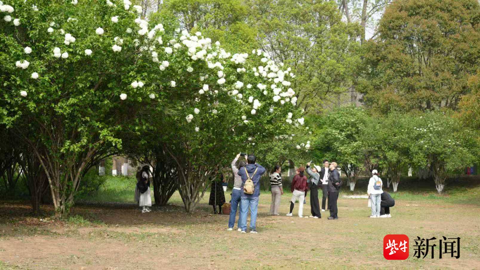 扬子晚报网4月14日讯(通讯员 纪安璐 记者 姜天圣)春意渐浓,花开正盛。近日,记者在南山景区西入口看到,大草坪旁一片木绣球已进入盛花期,远远望去如云似雪,吸引不少市民游客前来赏花打卡。