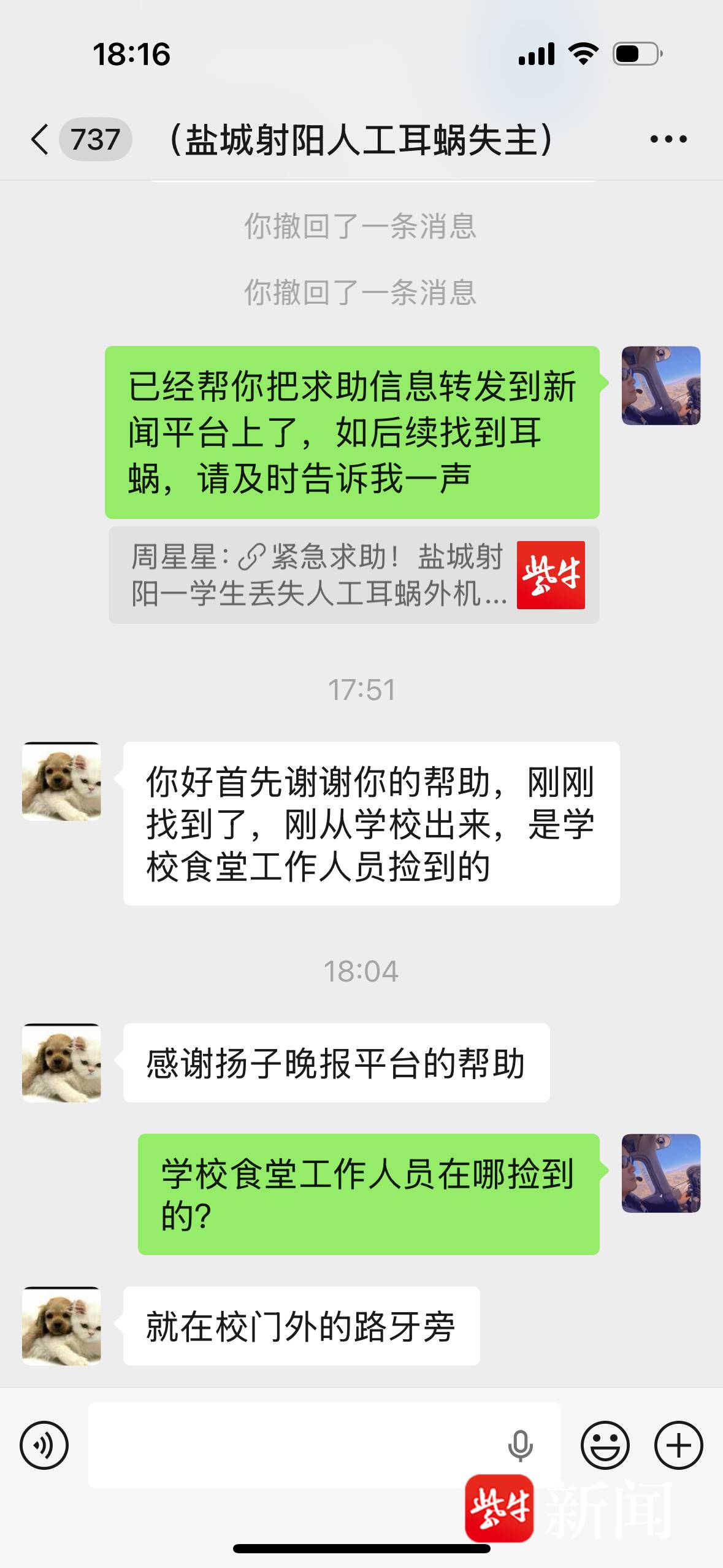 4月13日报道发布后迅速引发广泛关注,射阳发布等官方媒体及时转发扩散,热心网友、师生家长纷纷转发到各类微信群、学校班级群,一场跨越网络与线下的全城爱心寻物行动迅速展开。尤为暖心的是,看到报道的射阳发布工作人员家中孩子也佩戴双侧人工耳蜗,感同身受之下主动联系高先生,为寻回耳蜗提供帮助。